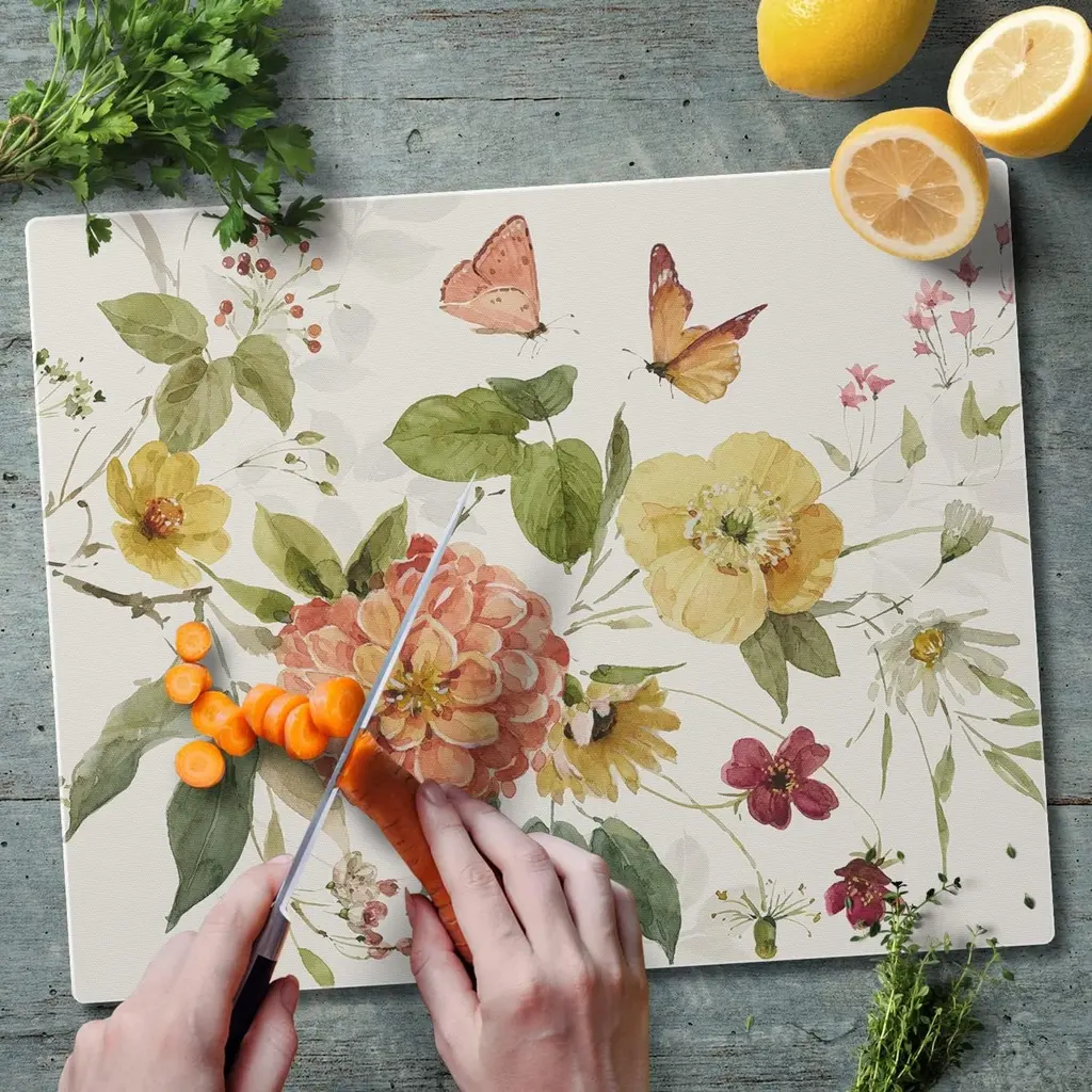 Blessed by Nature 3mm Heat Tolerant Tempered Glass Cutting Board. Manufactured in the USA in our Springfield TN facility. Great for food preparation, cutting and serving. Made of high quality 3mm Tempered Glass that is safe for temperatures up to 400 degrees F or 204 degrees C. Measures 15" x 12". Non-Skid Rubber Feet included on back of the board to prevent movement of the board when in use. Protects your surfaces from scratches and stains when preparing food. Artistic design allows the Cutting Board to remain displayed when not in use. Adds color and distinction to your space. Cutting Board is dishwasher safe.