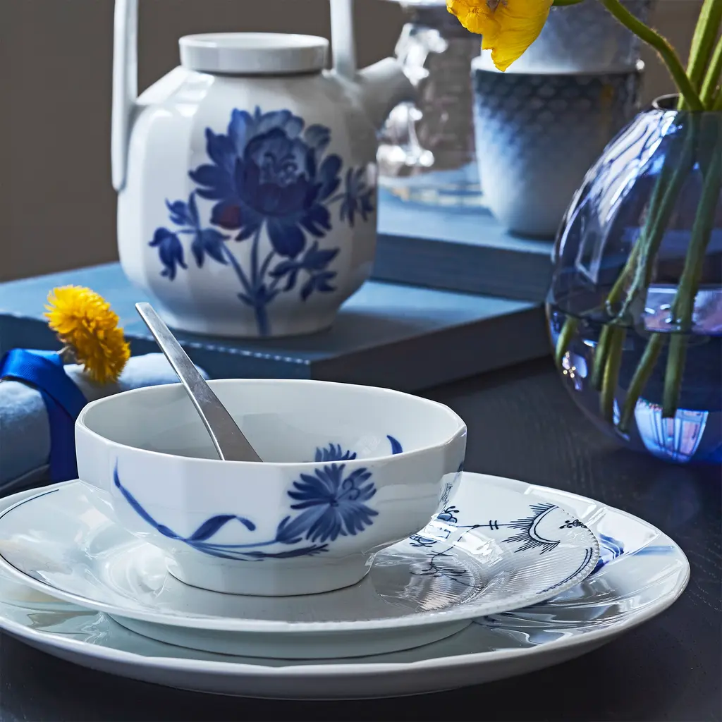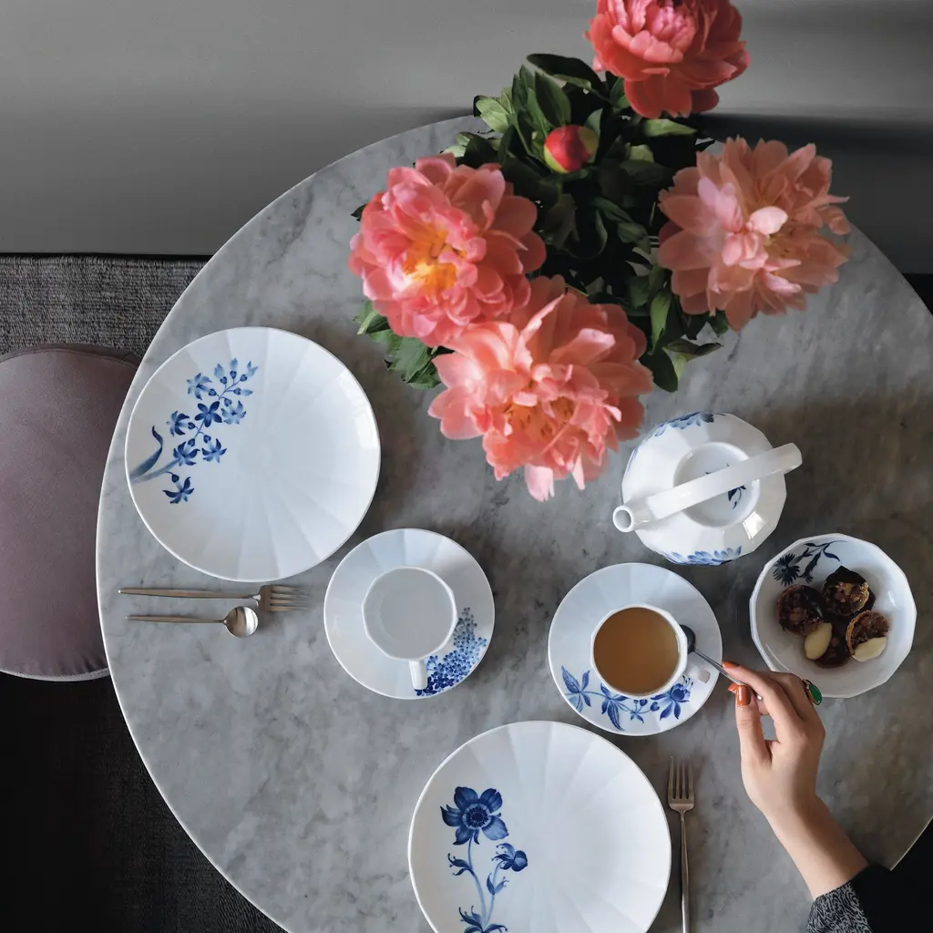 Peonies, lilacs, dahlias and more bloom across Royal Copenhagen's porcelain collection of understated, modern dinnerware.