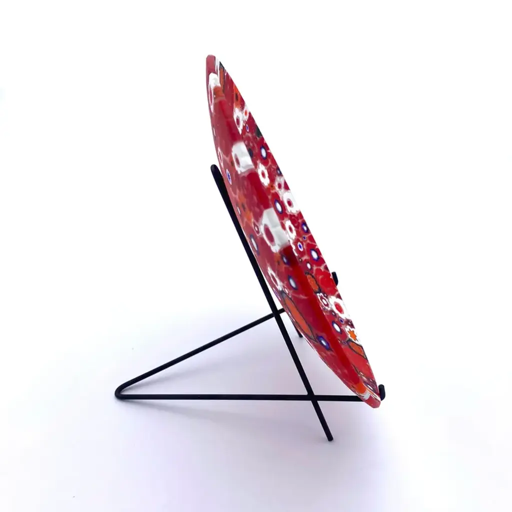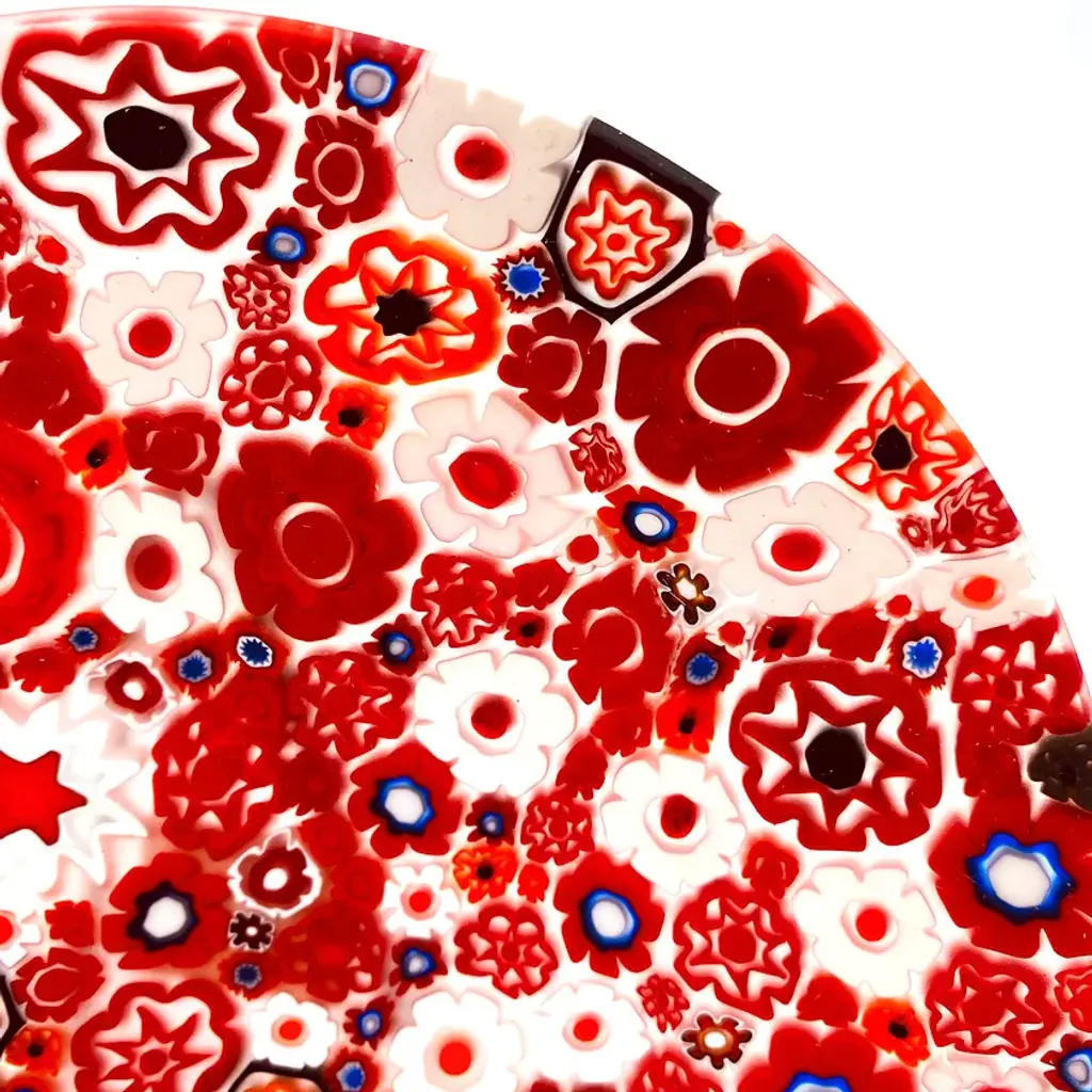 BLOOM RED is a red Murano glass plate embodies artisanal artistry and elegance. Red murrine create a captivating pattern, a timeless addition to your home. Dozens of exquisite decorative plates and a wide range of options to choose from. Modern, classic, multicolored, monochromatic, transparent, simple and minimalist, or more sophisticated and elegant, with matte, satin, or translucent finishes. You will be impressed by the refinement and elegance of our hand-blown glass plates, authentic Venetian glass objects that you can only find in our catalog. All our products are artisanal and of the highest production quality. Non-substantial variations in shape, size, color, and/or minor imperfections are inevitable and are typical of manual glasswork, showcasing the artisanal craftsmanship.