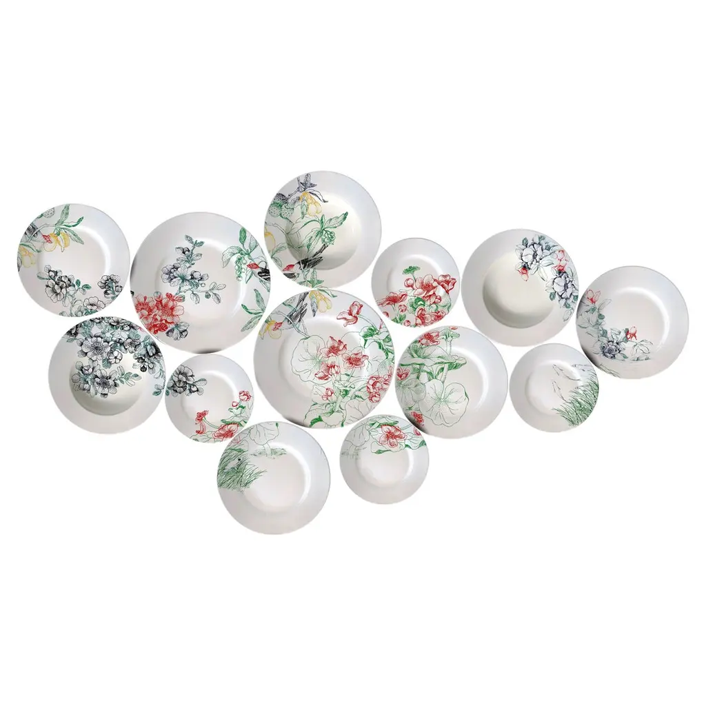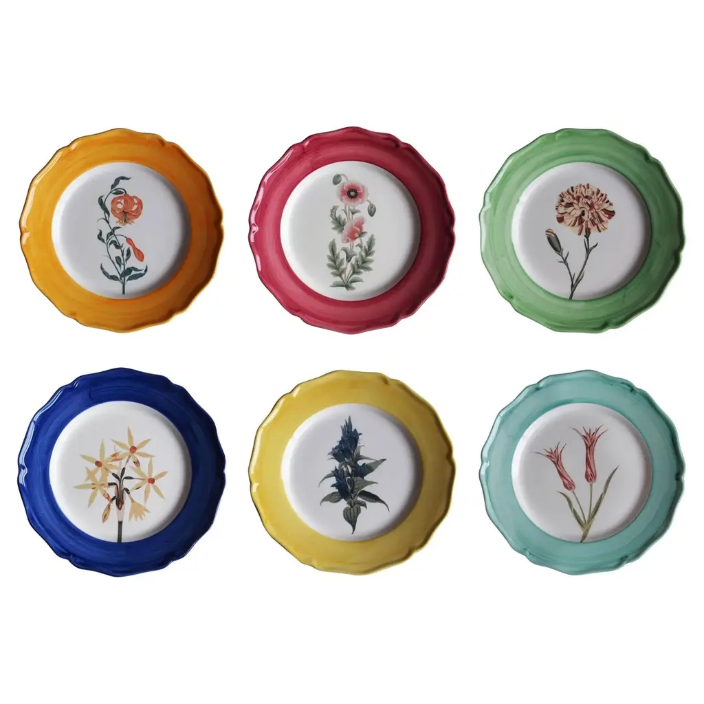Every plate from this exquisite set is entirely crafted and painted exclusively by hand in the tradition and quality that have made Paravicini famous all over the world. Made of fine ceramic and finished with a glossy glaze, each plate features a particular flower variety (12 in total) in all their vibrant colors and splendid contours. Plates be styled on a buffet table to bring a romantic note to a dinner or evening party.