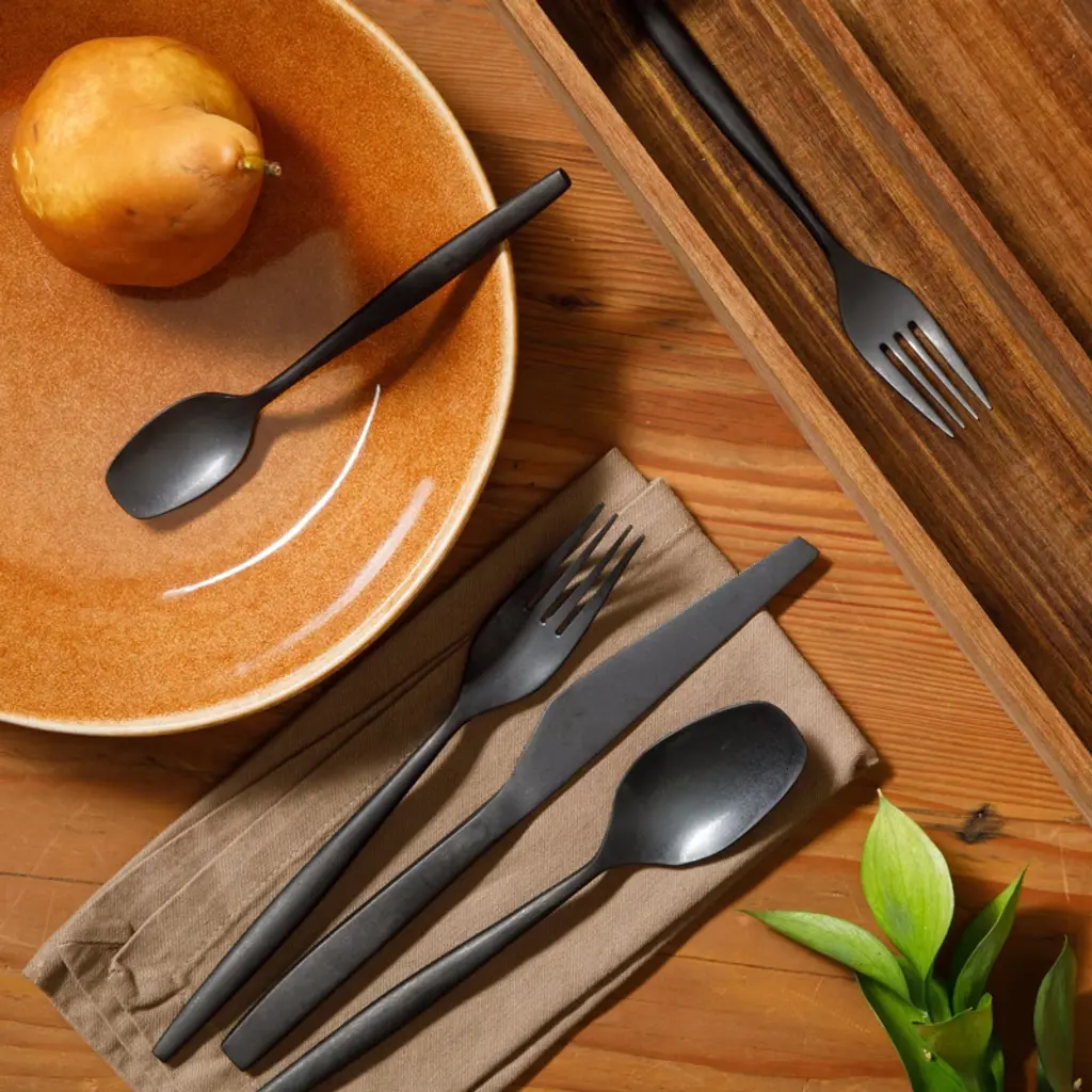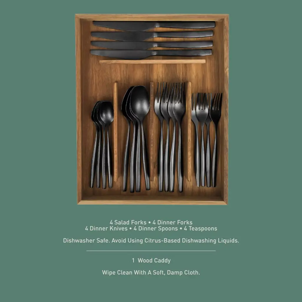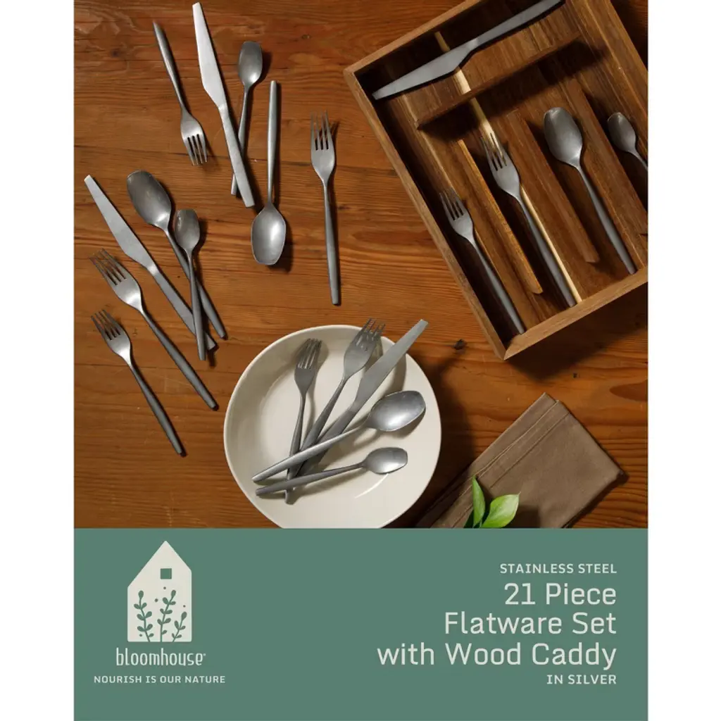 An intermix of modern symmetry, vintage style and delicate profiles, the Bloomhouse® 21-piece Stonewash Flatware Set delivers front-row quality utensils to furnish any place setting with durability, sophistication, and form-first function. Tumbled and washed between Earth's natural stones, this flatware set conjures a vintage style that combines freshness in detail with familiarity in emotion. The tapered head and handle create a slender, geometric shape that is easy on the eyes and gentle to the touch. As durable as they are decorative, these stainless steel forks and spoons punctuate a welcome invitation for guests to make and marvel at memories around the table. Dishwasher safe.An intermix of modern symmetry, vintage style and delicate profiles, the Bloomhouse® 21-piece Stonewash Flatware Set delivers front-row quality utensils to furnish any place setting with durability, sophistication, and form-first function. Tumbled and washed between Earth's natural stones, this flatware set conjures a vintage style that combines freshness in detail with familiarity in emotion. The tapered head and handle create a slender, geometric shape that is easy on the eyes and gentle to the touch. As durable as they are decorative, these stainless steel forks and spoons punctuate a welcome invitation for guests to make and marvel at memories around the table. Dishwasher safe.bloomhouse™ is a collection of modern-day kitchen and dining pieces that empower spirits, honor our Earth and celebrate its people. Driven by a responsible, nature-positive ethos, bloomhouse™ aspires to share a lifestyle that's good for you and good for the planet. With a mission rooted in purpose, bloomhouse™ will plant a tree on your behalf with every set sold in partnership with the non-profit organization One Tree Planted. Cook, dine, bake, store, drink - and raise a glass with us. Nourish is Our Nature, and now it's yours too. A COMPLETE SET INCLUDES: Four dinner forks, four dinner spoons, four dinner knives, four salad forks, four teaspoons and one wood caddy NOURISH IS OUR NATURE: bloomhouse™ is a collection of modern-day kitchen and dining pieces that empower spirits, honor our Earth and celebrate its people. Driven by a responsible, nature-positive ethos, bloomhouse™ aspires to share a lifestyle that's good for you and good for the planet.ONE TREE PLANTED PER SET SOLD: In partnership with One Tree Planted, bloomhouse™ will plant a tree around the world for every set sold, keeping our planet healthy and thriving while encouraging acts of kindness and growth. STAINLESS STEEL FLATWARE: Elegant profiles of forks and spoons crafted from stainless steel to furnish any place setting with durability, sophistication and form-first function. MATTE STONEWASH FINISH: Tumbled and washed using Earth's natural stones, this flatware set conjures up a vintage style that combines freshness in detail with familiarity in emotion. Unique variations celebrate the individuality of each utensil.GEOMETRIC SHAPES: Tapered heads and handles promote visual and functional symmetry. Soft corners and delicate lines bring are subtle and comfortable to the grip. Perfect for both everyday and occasional social gatherings. SERVICE FOR FOUR: Slender pieces of flatware are suitable for your most imaginative tablescapes when entertaining a group of 4 at home, or simply as an everyday pleasure. RUSTIC WOOD CADDY: Made from sustainable wood, the caddy features a warm, honey-brown color to beautifully display and store flatware. EASY-CARE FOR YOUR FLATWARE: Dishwasher safe