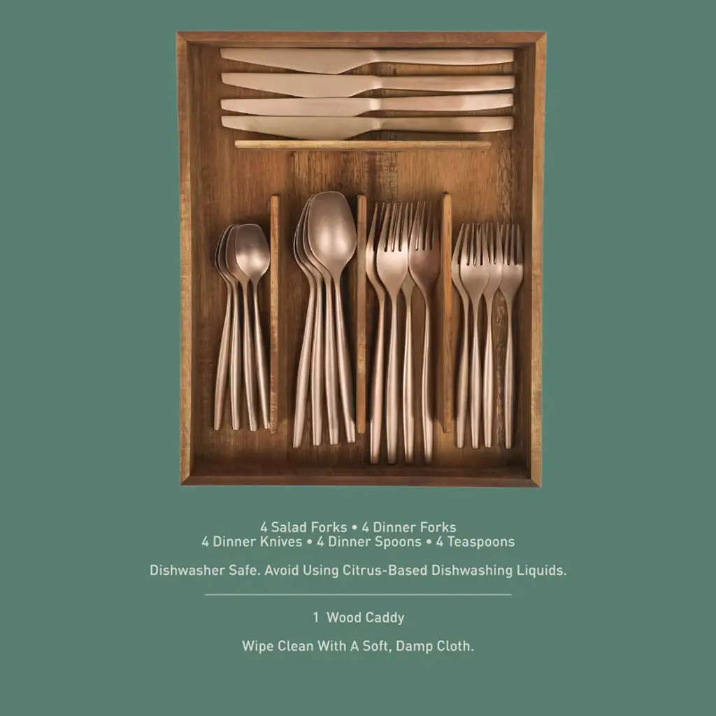 Bloomhouse 20 Piece Stone Washed Gold Flatware 18/10 Stainless Steel Silverware Cutlery Utensil Set With Acacia Wood Caddy - Service For 4