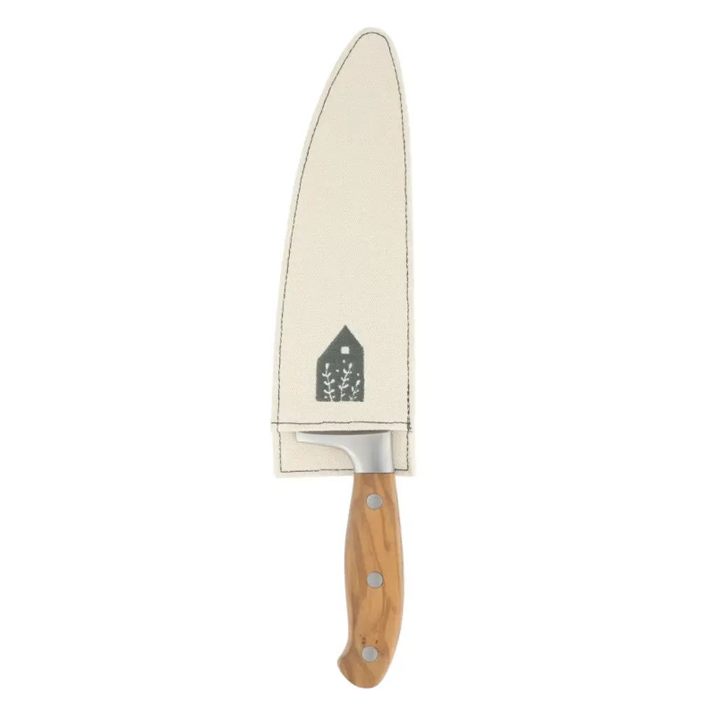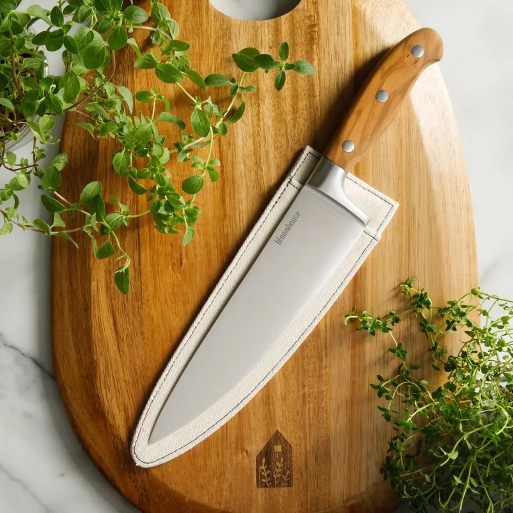 Favored in home and professional kitchens, high-quality German steel cutlery yields a variety of cuts and textures - from mincing aromatics, dicing vegetables to filleting fish and chopping prime steaks. Suitable for everyday use, a German steel knife is rust-resistant and easy to clean, sharpen and maintain. The bloomhouse™ German Steel Chef Knife is forged with a purpose - to wield sharpness and precision required to glide through prep work every day. The full-tang blade provides balance and even weight distribution to reduce pressure and wrist fatigue. Sustainable Italian Olive Wood handle elevates the style of the knife by blending rustic design and utilitarian function. As a nod to our Earth's beauty and resilience, the wood handle features a rustic grained pattern in a natural, golden honey-brown color to add character to the knife. Stainless steel rivets secure the handle and the knife for a strong grip and improved control. Hand wash only. Keep the knife in the protective canvas sheath for safe storage and protection when not in use. bloomhouse™ is a collection of modern-day kitchen and dining pieces that empower spirits, honor our Earth and celebrate its people. Driven by a responsible, nature-positive ethos, bloomhouse™ aspires to share a lifestyle that's good for you and good for the planet. With a mission rooted in purpose, bloomhouse™ will plant a tree on your behalf with every set sold in partnership with the non-profit organization One Tree Planted. Cook, dine, bake, store, drink - and raise a glass with us. Nourish is Our Nature, and now it's yours too. Favored in home and professional kitchens, high-quality German steel cutlery yields a variety of cuts and textures - from mincing aromatics, dicing vegetables to filleting fish and chopping prime steaks. Suitable for everyday use, a German steel knife is rust-resistant and easy to clean, sharpen and maintain. The bloomhouse™ German Steel Chef Knife is forged with a purpose - to wield sharpness and precision required to glide through prep work every day. The full-tang blade provides balance and even weight distribution to reduce pressure and wrist fatigue. Sustainable Italian Olive Wood handle elevates the style of the knife by blending rustic design and utilitarian function. As a nod to our Earth's beauty and resilience, the wood handle features a rustic grained pattern in a natural, golden honey-brown color to add character to the knife. Stainless steel rivets secure the handle and the knife for a strong grip and improved control. Hand wash only. Keep the knife in the protective canvas sheath for safe storage and protection when not in use. bloomhouse™ is a collection of modern-day kitchen and dining pieces that empower spirits, honor our Earth and celebrate its people. Driven by a responsible, nature-positive ethos, bloomhouse™ aspires to share a lifestyle that's good for you and good for the planet. With a mission rooted in purpose, bloomhouse™ will plant a tree on your behalf with every set sold in partnership with the non-profit organization One Tree Planted. Cook, dine, bake, store, drink - and raise a glass with us. Nourish is Our Nature, and now it's yours too. NOURISH IS OUR NATURE: bloomhouse™ is a collection of modern-day kitchen and dining pieces that empower spirits, honor our Earth and celebrate its people. Driven by a responsible, nature-positive ethos, bloomhouse™ aspires to share a lifestyle that's good for you and good for the planet.ONE TREE PLANTED PER SET SOLD: In partnership with One Tree Planted, bloomhouse™ will also plant a tree around the world for every piece sold in an effort to keep our planet healthy and thriving and encourage acts of kindness and moments of growth.WHAT'S IN THE BOX: One 8-inch German Steel chef knife with Italian Olive Wood handleFORGED WITH A PURPOSE: Versatile chef knife wields precision with flair and finesseHIGH-CARBON, HIGH QUALITY: Perfectly-balanced, high-carbon German Steel blade offers superior strength and easy alignment.FULL TANG CONSTRUCTION: Even weight distribution from the tip of the blade down to the handle provides support to the wrist to reduce pressure and fatigue.ITALIAN OLIVE WOOD HANDLE: Natural-grained Italian Olive Wood handle resists stains and offers a rustic appeal to any kitchen or tableRIVETED HANDLE: Stainless steel rivets secure the single-bolstered handle to provide a strong grip with improved controlEASY-CARE FOR YOUR CUTLERY: Hand wash only. The knife comes with a protective canvas sleeve for safe storage and protection.