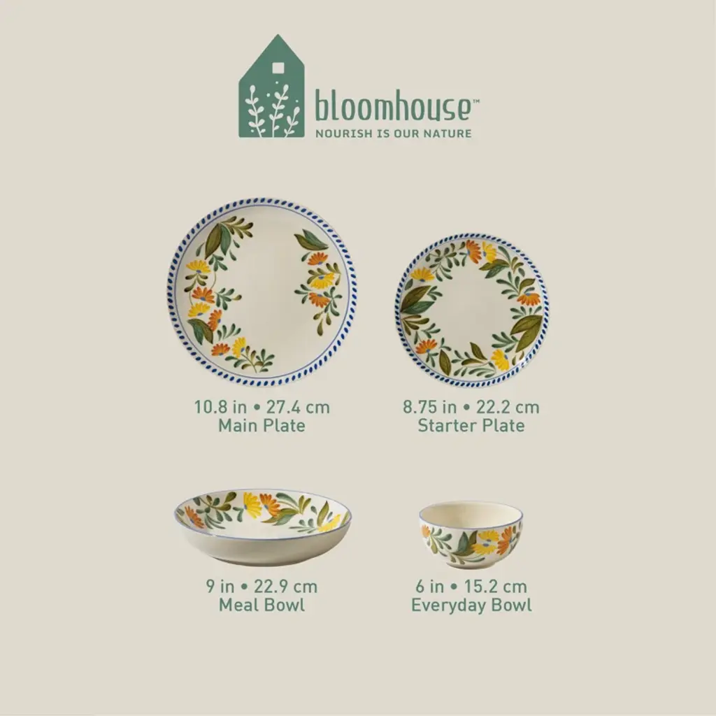 Celebrate traditional artistry and modern ceramic designs with the Posy Blossom 16-piece Handpainted Stoneware Set from bloomhouse. These stoneware plates and bowls are crafted from a mix of carefully selected and sustainable clays placed under high firing temperature to build a robust yet elegant set for elevated everyday dining. Handpainted floral motifs lend a vintage charm to every piece to serve anything from starters and mains to desserts and other creative pairings. Dishwasher and microwave safe.bloomhouse is a collection of modern-day kitchen and dining pieces that empower spirits, honor our Earth and celebrate its people. Driven by a responsible, nature-positive ethos, bloomhouse aspires to share a lifestyle that's good for you and good for the planet. With a mission rooted in purpose, bloomhouse will plant a tree on your behalf with every set sold in partnership with the non-profit organization One Tree Planted.Cook, dine, bake, store, drink - and raise a glass with us. Nourish is Our Nature, and now it's yours too.