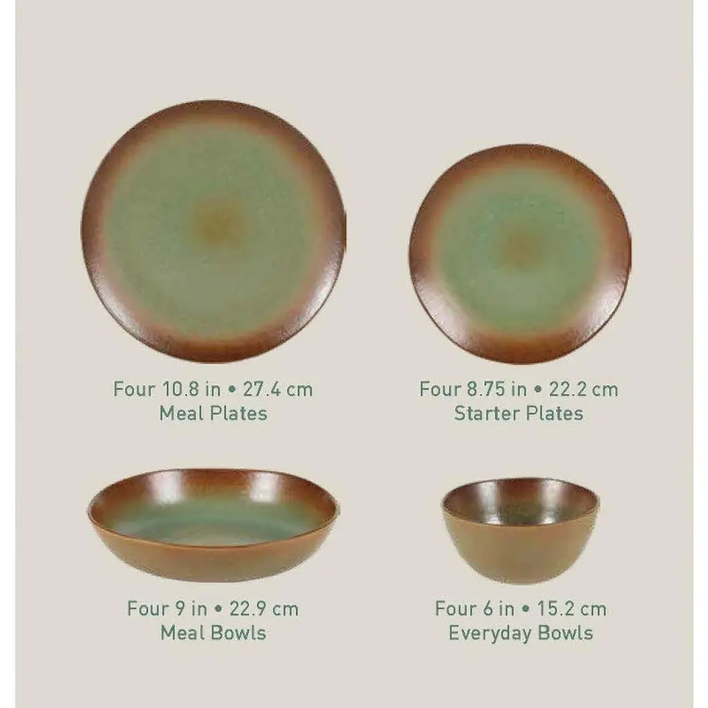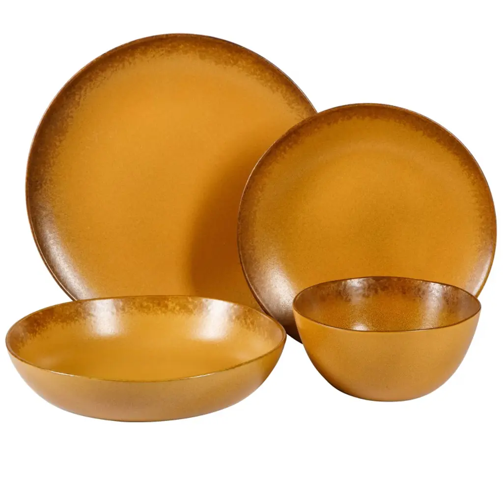 Let the Palermo Sun 16-piece Reactive Dinnerware Set from bloomhouse™ grace your kitchen or table with organic overtones and artisanal aesthetics every day. Made from carefully selected and sustainable clays, this stoneware dinnerware collection brings substantial style and heft to elevate dining and entertaining at home. Rustic shapes lend a handmade look and feel, like each plate and bowl came out of your favorite pottery studio. Peppered with intentional flecks from the reactive glaze finish, these pieces play well with other tabletop coordinates to set your most imaginative tablescapes. Rich in character and full of life, this set outfits any place setting for weeknight suppers and fancier fares. Dishwasher and microwave safe. bloomhouse™ is a collection of modern-day kitchen and dining pieces that empower spirits, honor our Earth and celebrate its people. Driven by a responsible, nature-positive ethos, bloomhouse™ aspires to share a lifestyle that's good for you and good for the planet. With a mission rooted in purpose, bloomhouse™ will plant a tree on your behalf with every set sold in partnership with the non-profit organization One Tree Planted. Cook, dine, bake, store, drink - and raise a glass with us. Nourish is Our Nature, and now it's yours too.Let the Palermo Sun 16-piece Reactive Dinnerware Set from bloomhouse grace your kitchen or table with organic overtones and artisanal aesthetics every day. Made from carefully selected and sustainable clays, this stoneware dinnerware collection brings substantial style and heft to elevate dining and entertaining at home. Rustic shapes lend a handmade look and feel, like each plate and bowl came out of your favorite pottery studio. Peppered with intentional flecks from the reactive glaze finish, these pieces play well with other tabletop coordinates to set your most imaginative tablescapes. Rich in character and full of life, this set outfits any place setting for weeknight suppers and fancier fares. Dishwasher and microwave safe. bloomhouse is a collection of modern-day kitchen and dining pieces that empower spirits, honor our Earth and celebrate its people. Driven by a responsible, nature-positive ethos, bloomhouse aspires to share a lifestyle that's good for you and good for the planet. With a mission rooted in purpose, bloomhouse will plant a tree on your behalf with every set sold in partnership with the non-profit organization One Tree Planted. Cook, dine, bake, store, drink - and raise a glass with us. Nourish is Our Nature, and now it's yours too. WHAT'S IN THE BOX: Four 11-inch meal plates, four 8-inch starter plates, four 6-inch everyday bowls, and four 9-inch meal bowlsNOURISH IS OUR NATURE: bloomhouse is a collection of modern-day kitchen and dining pieces that empower spirits, honor our Earth and celebrate its people. Driven by a responsible, nature-positive ethos, bloomhouse aspires to share a lifestyle that's good for you and good for the planet.ONE TREE PLANTED PER SET SOLD: In partnership with One Tree Planted, bloomhouse will plant a tree around the world for every set sold, keeping our planet healthy and thriving while encouraging acts of kindness and growth.STONEWARE CRAFTSMANSHIP: A mix of sustainable clays shaped and placed under high firing temperature to produce a thoughtfully-crafted dinnerware set with form and function.SERVICE FOR FOUR: Rustic stoneware set is suitable for your most imaginative tablescapes when entertaining a group of 4 at home, or simply as an everyday pleasure.ORGANIC SHAPES: Each plate and bowl offers style and authenticity like they came out from your favorite pottery studio.UNIQUE VARIATIONS: Artisanal flecks from reactive glazing techniques highlight traditional artistry and modern ceramic designs.EASY-CARE FOR YOUR DINNERWARE: Dishwasher and microwave safe