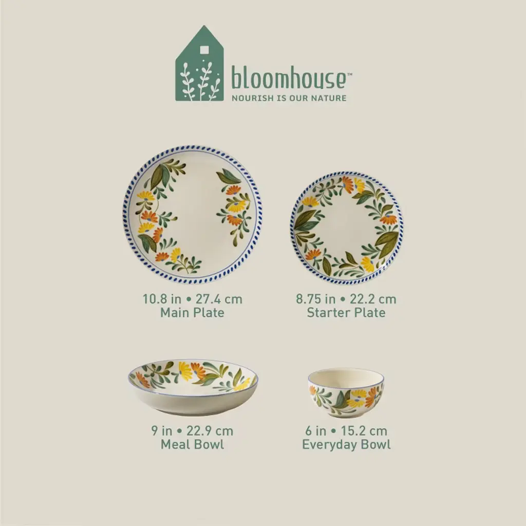 Celebrate traditional artistry and modern ceramic designs with the Posy Blossom 16-piece Handpainted Stoneware Set from bloomhouse™. These stoneware plates and bowls are crafted from a mix of carefully selected and sustainable clays placed under high firing temperature to build a robust yet elegant set for elevated everyday dining. Handpainted floral motifs lend a vintage charm to every piece to serve anything from starters and mains to desserts and other creative pairings. Dishwasher and microwave safe. bloomhouse™ is a collection of modern-day kitchen and dining pieces that empower spirits, honor our Earth and celebrate its people. Driven by a responsible, nature-positive ethos, bloomhouse™ aspires to share a lifestyle that's good for you and good for the planet. With a mission rooted in purpose, bloomhouse™ will plant a tree on your behalf with every set sold in partnership with the non-profit organization One Tree Planted. Cook, dine, bake, store, drink - and raise a glass with us. Nourish is Our Nature, and now it's yours too. Celebrate traditional artistry and modern ceramic designs with the Posy Blossom 16-piece Handpainted Stoneware Set from bloomhouse™. These stoneware plates and bowls are crafted from a mix of carefully selected and sustainable clays placed under high firing temperature to build a robust yet elegant set for elevated everyday dining. Handpainted floral motifs lend a vintage charm to every piece to serve anything from starters and mains to desserts and other creative pairings. Dishwasher and microwave safe.bloomhouse™ is a collection of modern-day kitchen and dining pieces that empower spirits, honor our Earth and celebrate its people. Driven by a responsible, nature-positive ethos, bloomhouse™ aspires to share a lifestyle that's good for you and good for the planet. With a mission rooted in purpose, bloomhouse™ will plant a tree on your behalf with every set sold in partnership with the non-profit organization One Tree Planted.Cook, dine, bake, store, drink - and raise a glass with us. Nourish is Our Nature, and now it's yours too. WHAT'S IN THE BOX: Four 11-inch dinner plates, four 8-inch dessert plates, four 9-inch dinner bowls, and four 6-inch cereal bowls NOURISH IS OUR NATURE: bloomhouse™ is a collection of modern-day kitchen and dining pieces that empower spirits, honor our Earth and celebrate its people. Driven by a responsible, nature-positive ethos, bloomhouse™ aspires to share a lifestyle that's good for you and good for the planet.ONE TREE PLANTED PER SET SOLD: In partnership with One Tree Planted, bloomhouse™ will plant a tree around the world for every set sold, keeping our planet healthy and thriving while encouraging acts of kindness and growth.STONEWARE CRAFTSMANSHIP: A mix of sustainable clays shaped and placed under high firing temperature to produce a thoughtfully-crafted dinnerware set with form and function.HANDPAINTED POSIES: Floral motifs sprawled on the glazed plates and bowls allow for beautiful plating stylesVERSATILE DINNER BOWLS: Low, entreé bowls offer a catchall presentation for any meal. Their versatile shape - a combination of a plate and a bowl - is suitable to contain dressed salads, composed meals, pastas, soups, or scoops of soft-served ice cream for sharing.EASY-CARE FOR YOUR DINNERWARE: Dishwasher and microwave safe