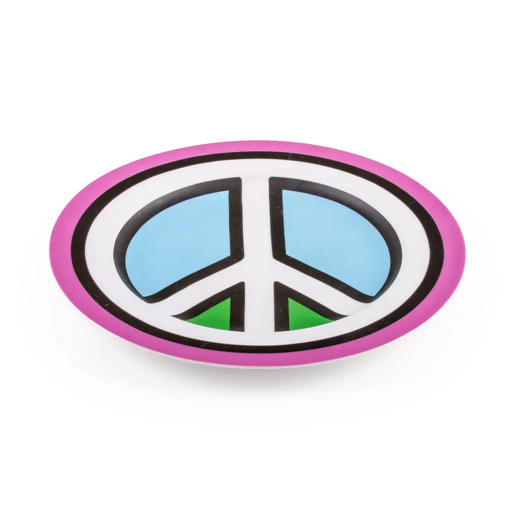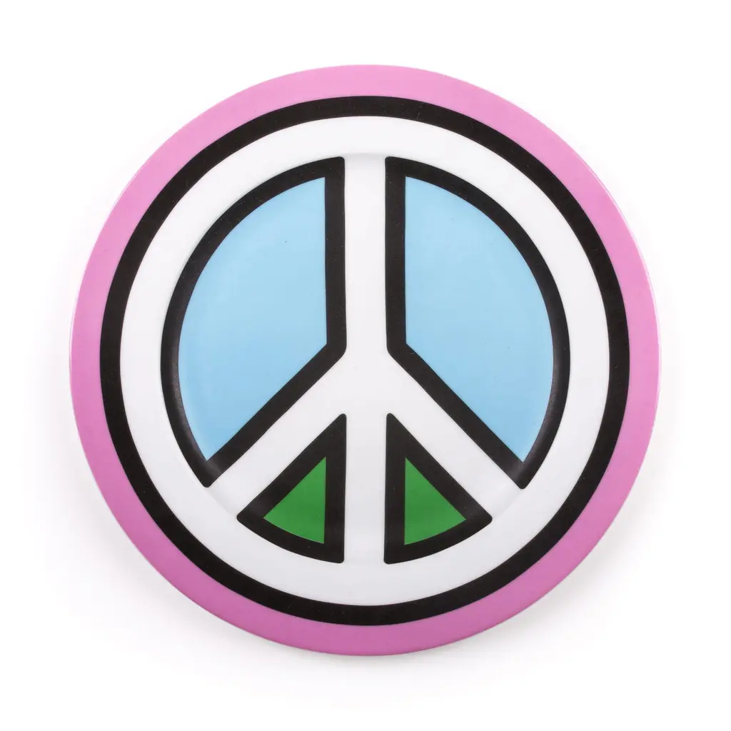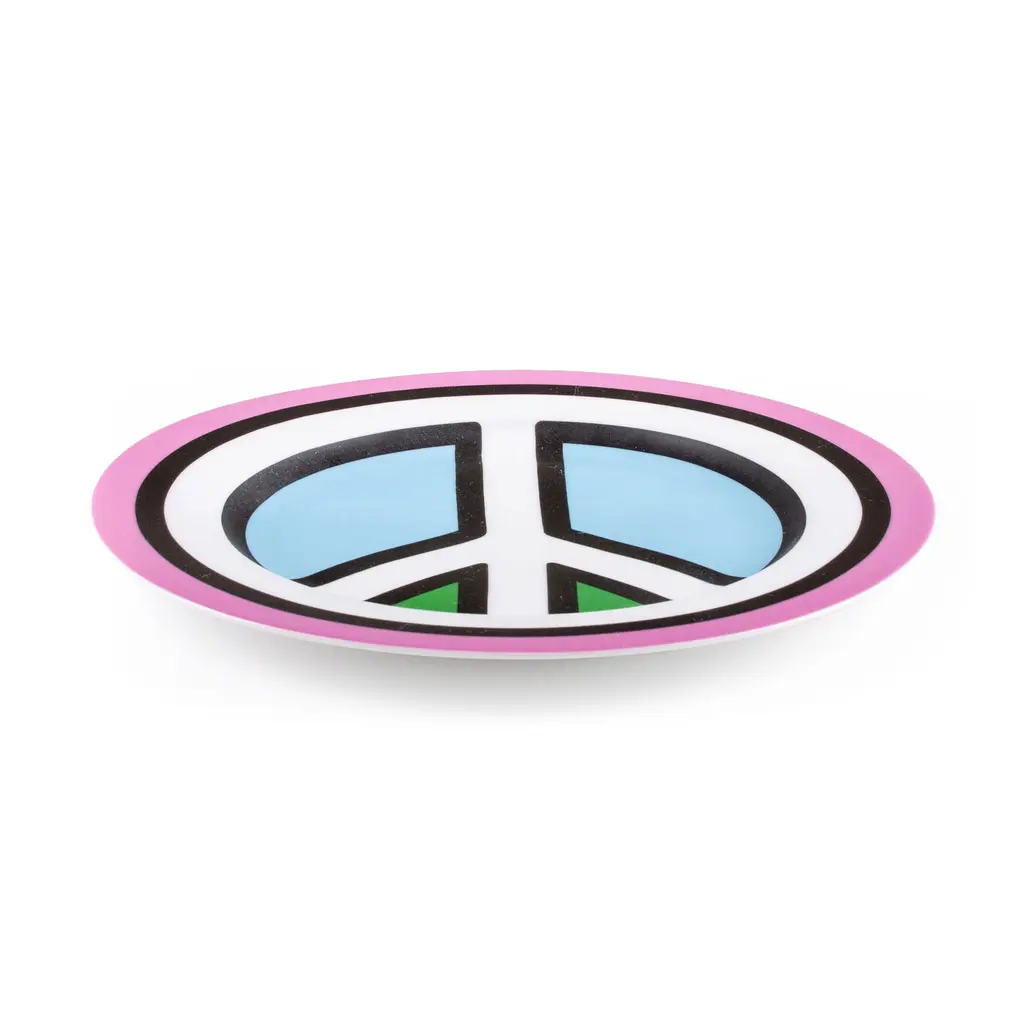 Part of the vibrant Blow collection created by Studio Job and Seletti, the porcelain plate range reimagines traditional dinnerware as pop art. The Peace design recreates the iconic symbol with clean and bold lines as well as light blue, pink, white, and black tones, ensuring that the plate will always stand out at any dinner party. Although it features vibrant colors and an ultra-sharp design, this Seletti porcelain plate is completely safe to use in a microwave or dishwasher. Use it in a set or pair it with other designs from the same collection, to bring the pop art look and feel of the range into your home.