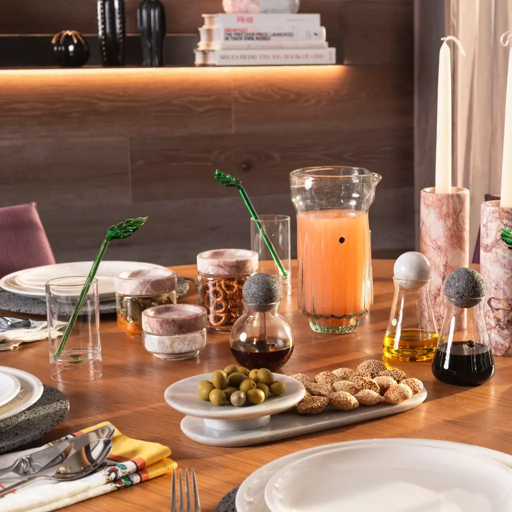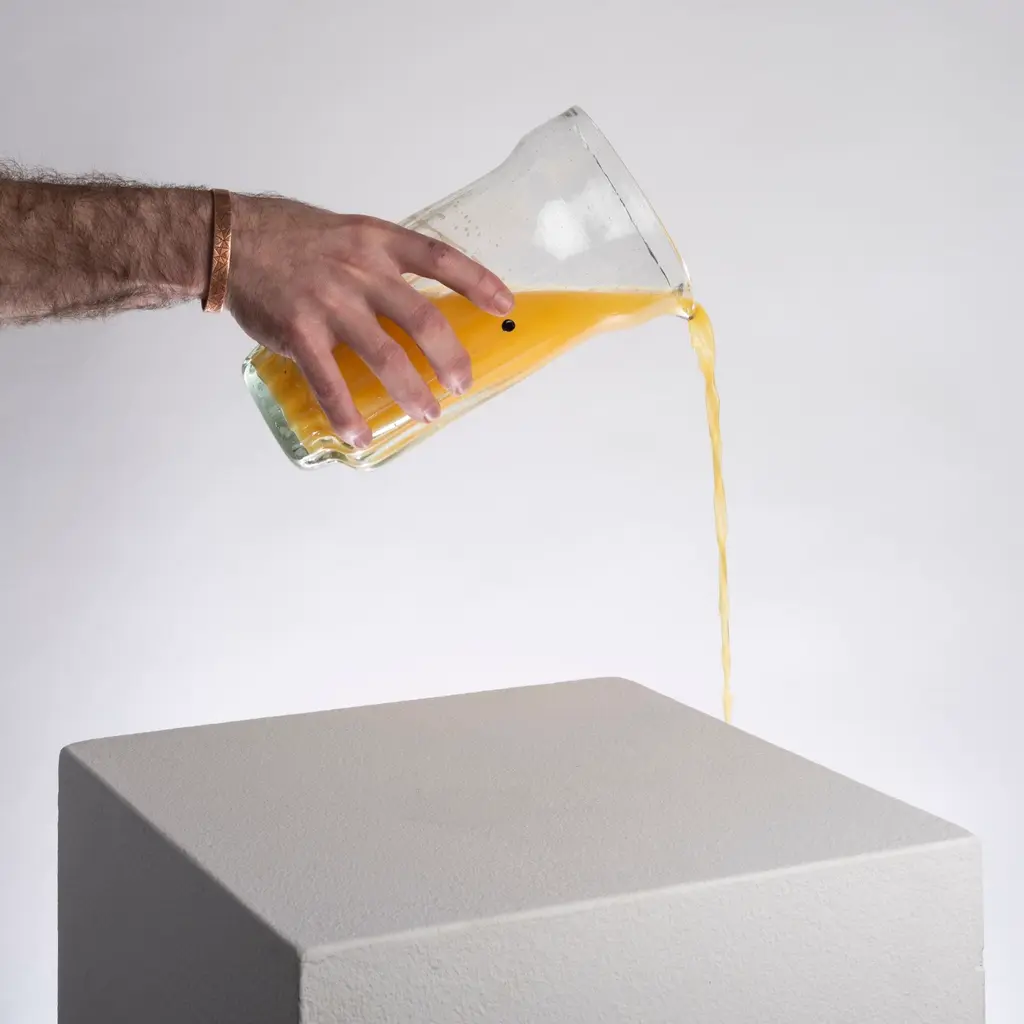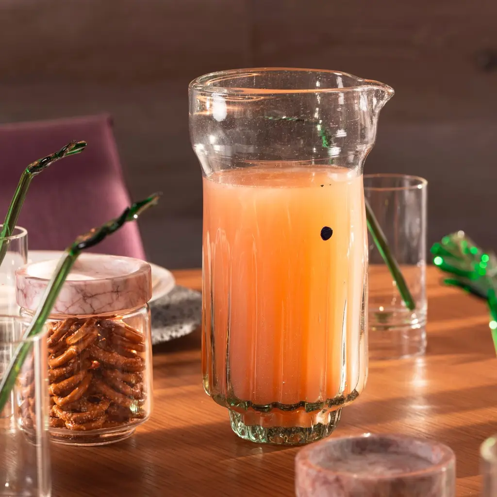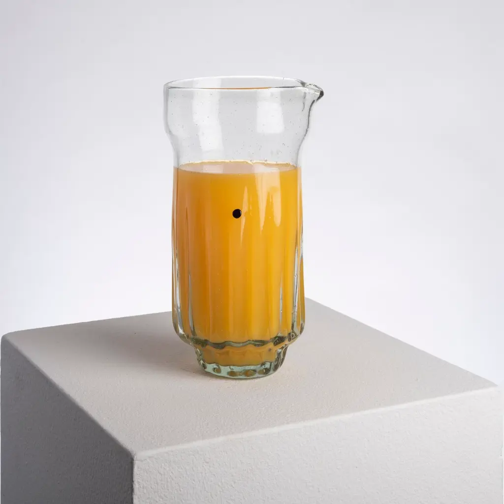 Recycled glass blown jug. It was designed in collaboration with design students in Mexico City in order to promote youth design. It was made for a traditional or rustic environments where glass blends perfectly with the environment. The perfect contrast for ever space!