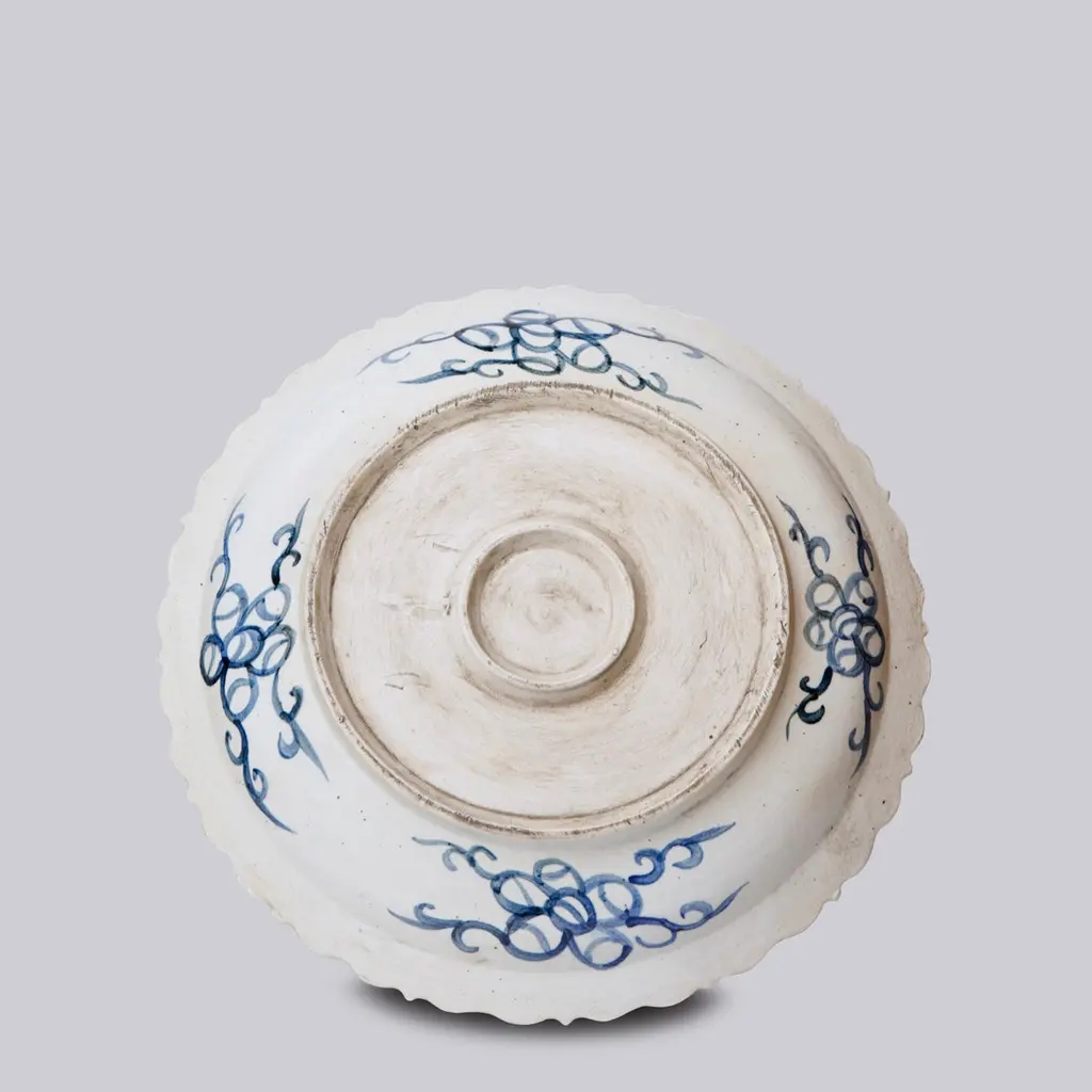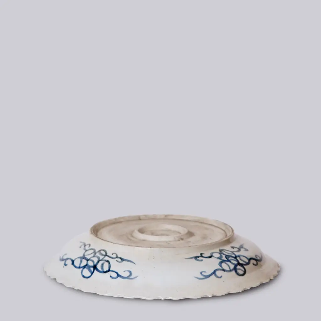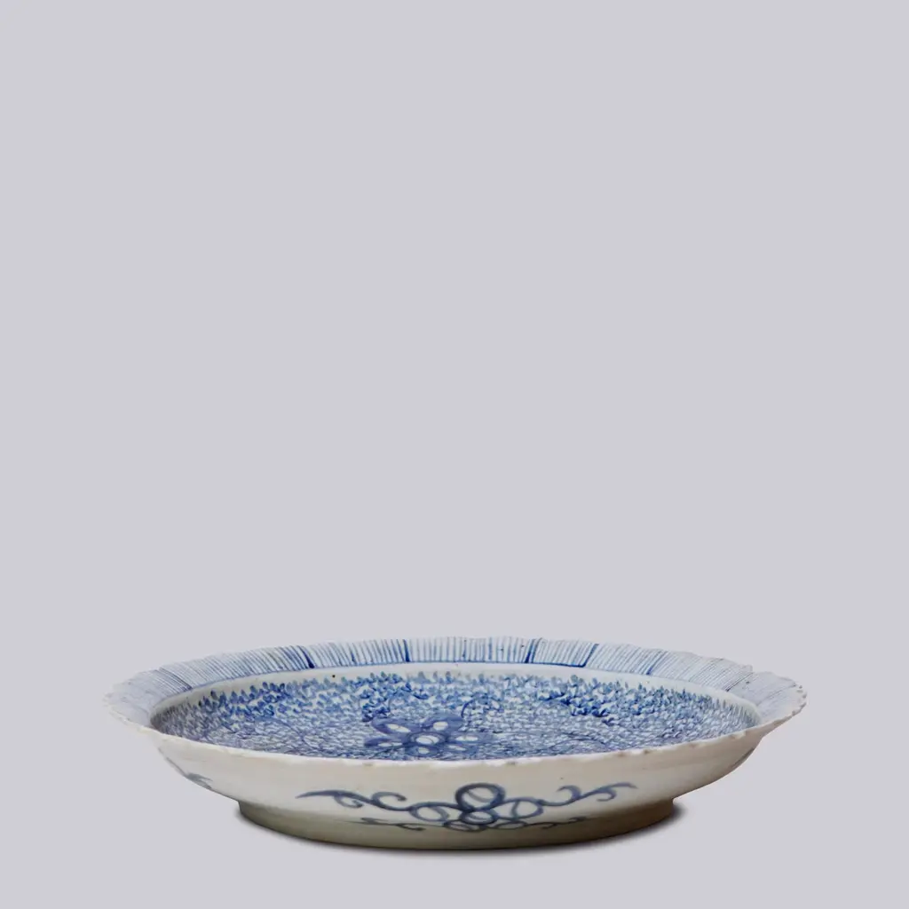 Blue And White Porcelain Platter With Floral Design And Foliated Rim