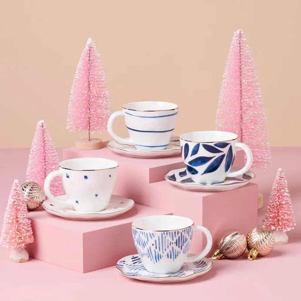 These adorable espresso cups and saucer sets from our Blue Bay collection are a perfect match for after-dinner treats. These sweetly-patterned cups are also ideal for your morning espresso shot or an afternoon pick-me-up. Serve with an orange twist on the saucer for a bright pop of color.