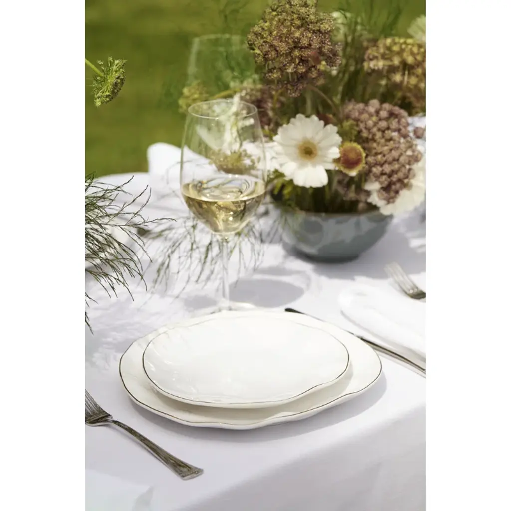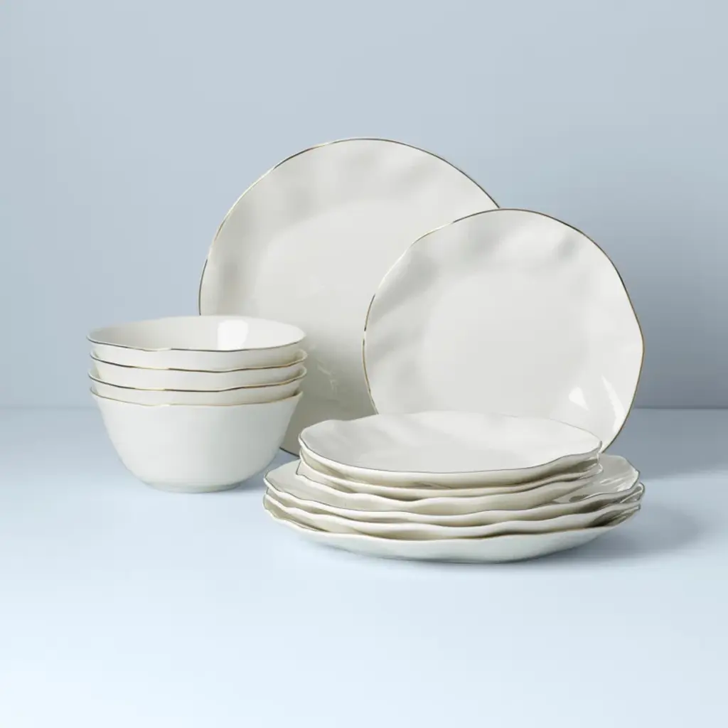 Set your table in timeless style with this 12-piece dinnerware set, designed to serve four. Crafted from porcelain china, each piece showcases a classic round shape with a gold rim for a touch of sophistication. The set includes four dinner plates, four salad plates, and four 20oz. bowls – all dishwasher-, microwave-, and oven-safe for easy care and convenience. Chip- and scratch-resistant, this dinnerware set is perfect for everyday use or special occasions, adding a touch of classic charm to your dining experience.