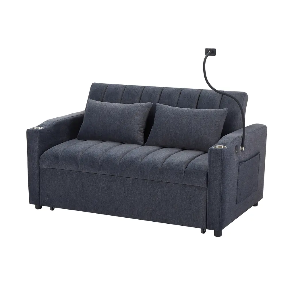 Blue Convertible Sleeper Sofa Bed 55.9" Loveseat Sofa With 2 Cup Holders, 3 Usb Ports And 360 Phone Holder - Blue-Gray