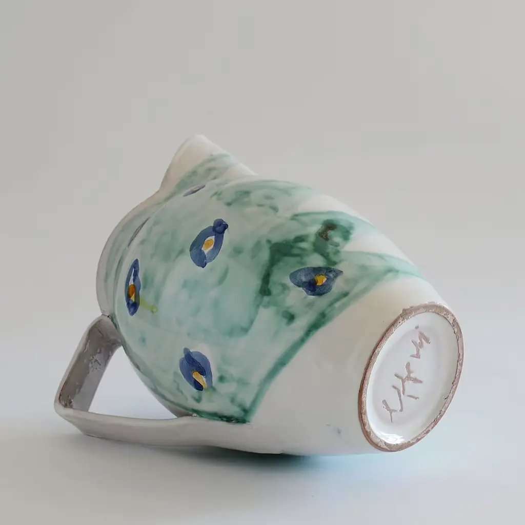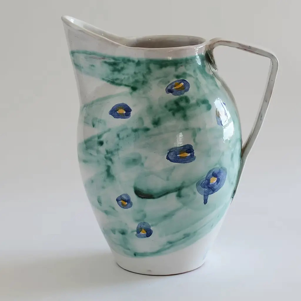 This exquisite ceramic jug was hand made on a lathe and then glazed with a dynamic brush stroke pattern in green with blue floral details. Due to its hand-crafted nature, reproductions of this piece will be similar but not identical.