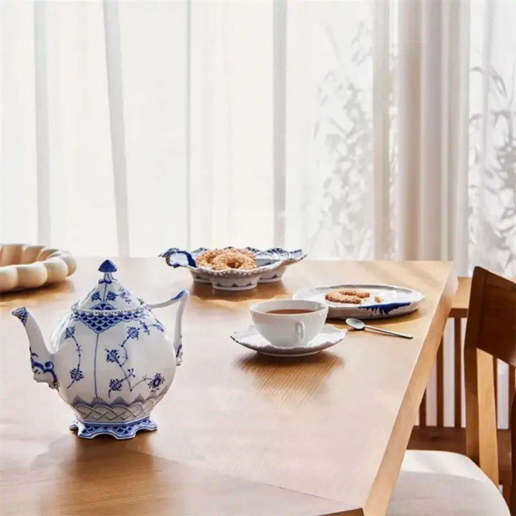 Originally created in 1885, the Blue Fluted Full Lace collection is an outstanding example of Royal Copenhagen's fine craftsmanship. This teapot is beautifully ornamented with lace details, a snail shell on the lid and baroque masks at the base of the spout and handle. Perfect for tea lovers and porcelain collectors alike. The epitome of porcelain craftsmanship, Blue Fluted Full Lace presents hand painted beauty at its absolute finest. The iconic, open-work lace border of the collection is carefully created, with each individual piercing in the lace delicately made by hand, and afterwards hand painted with the classic pattern of florals and fine lines. Elaborate with a passion. Royal Copenhagen is a world famous brand producing exclusive, high-quality porcelain dinnerware, figurines, home decor items and collectibles that delight collectors and new generations of customers. Originally owned by the Danish Royal Family, they produced fine porcelain for the Queen of Denmark. In the trademark Danish colors of blue and white, Royal Copenhagen's designs have been handpainted and manufactured by ancient methods refined since 1775. They are well known for their Flora Danica and Blue Fluted collections, which are but part of a line of 135 dinnerware patterns.
