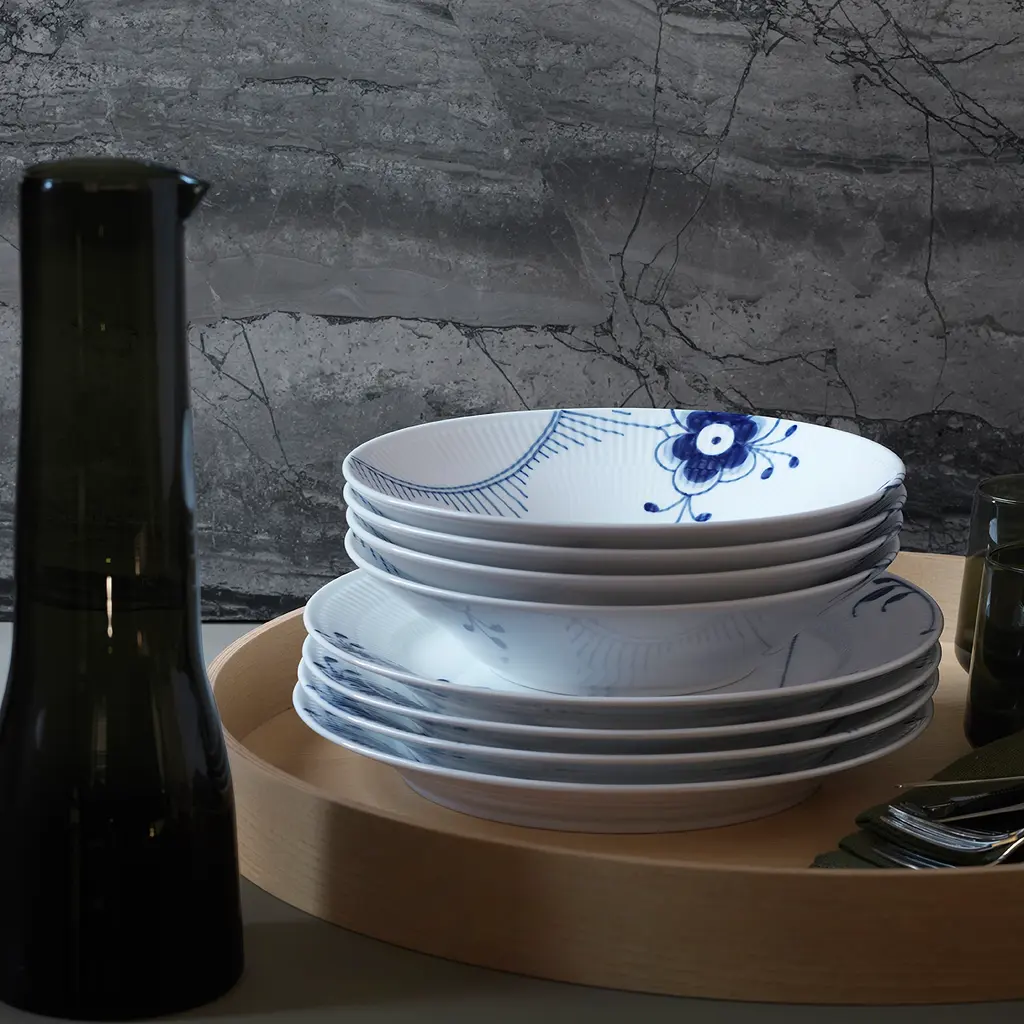 Royal Copenhagen's Blue Fluted Mega collection is the creation of designer Karen Kjaelgaard Larsen, whose fresh takes on porcelain painting have captured the attention of connoisseurs worldwide. Decorated with hand-painted enlargements of a timeless flower pattern, this series balances form and function seamlessly for an artful presentation that will endure over time.