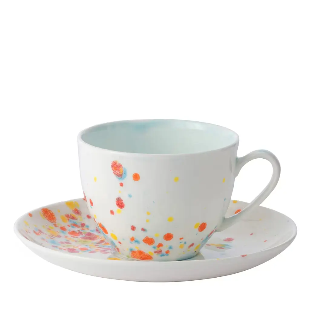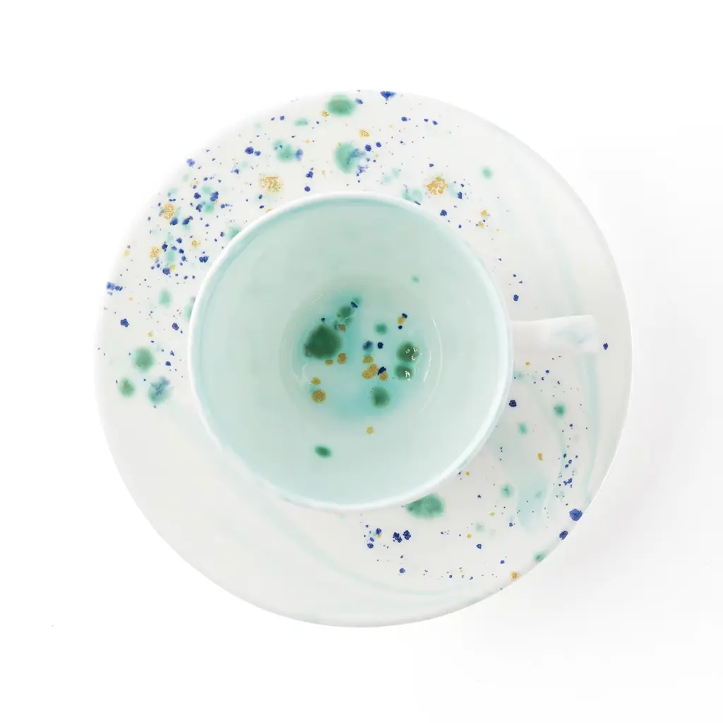 The artistic sensibility of Coralla Maiuri is exemplified in the sublime details of these two tea cups with matching saucers made of fine porcelain. Inspired by natural marble, a myriad of dappled speckles in blue and green with yellow spots is randomly sprinkled all around the exterior, while the interior is veiled by a turquoise halo of great refinement. Every single detail is painted by hand by the artist, lending each item a one-of-a-kind allure and visual character.