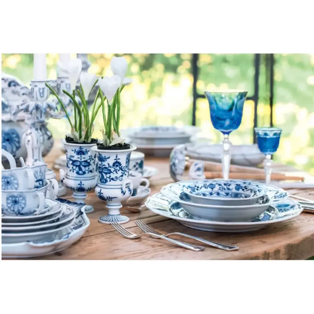 The history of the “Onion Pattern” began with the search of a special blue color to emphasize the unprecedented whiteness of Meissen's porcelain. After numerous tests, they combined cobalt and oxygen to create a blue that was extremely heat-resistant. Thus, in 1722, the new paint made it possible to apply Meissen’s trademark, the Crossed Swords, in cobalt blue under the glaze for the first time. This technique protected the trademark and made it impossible to duplicate. Inspired by East Asian patterns, which were predominantly blue at the time, Meissen’s radiant blue “Onion Pattern” was created from 1731 and would go on to become famous around the world. The “onions” in the pattern are not actually onions, but rather peaches and melons on the rims, and bamboo stalks and delicate chrysanthemum blossoms in the center. In 2004, Onion was modernized to include a chrysanthemum winding along the plate's rim. The vined bamboo shoot with delicate blossoms, along with the original pattern's double leaft have remained, while the fruits have disappeared altogether. This new pattern is a lighter, breezier offshoot of the 1731 original, allowing the porcelain to shine. As the oldest trademark in Europe, the Crossed Swords from the coat of arms of the Electorate of Saxony have represented the exceptional quality of Meissen porcelain since 1722. To this day, the trademark is applied by hand to every piece of Meissen porcelain in the manufactory’s own cobalt blue by Meissen’s “swordsmen” – painters specialising in the Crossed Swords. The Crossed Swords have been a component of the onion pattern since 1888. Set in the foot of the bamboo stalks, the swords attest to the piece’s authenticity and guarantee Meissen’s exceptional porcelain quality and craftsmanship Founded in 1710 by King Augustus the Strong, Meissen is the oldest porcelain manufactory in Europe and enjoys worldwide acclaim for its exceptional craftsmanship. Meissen and its crossed swords insignia are synonymous with the highest quality porcelain; every Meissen piece is entirely crafted in-house in the state of Saxony (Germany).