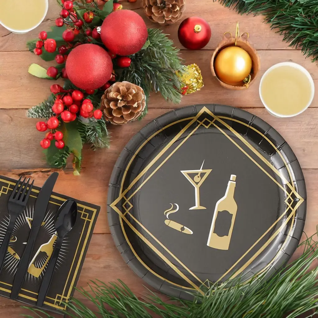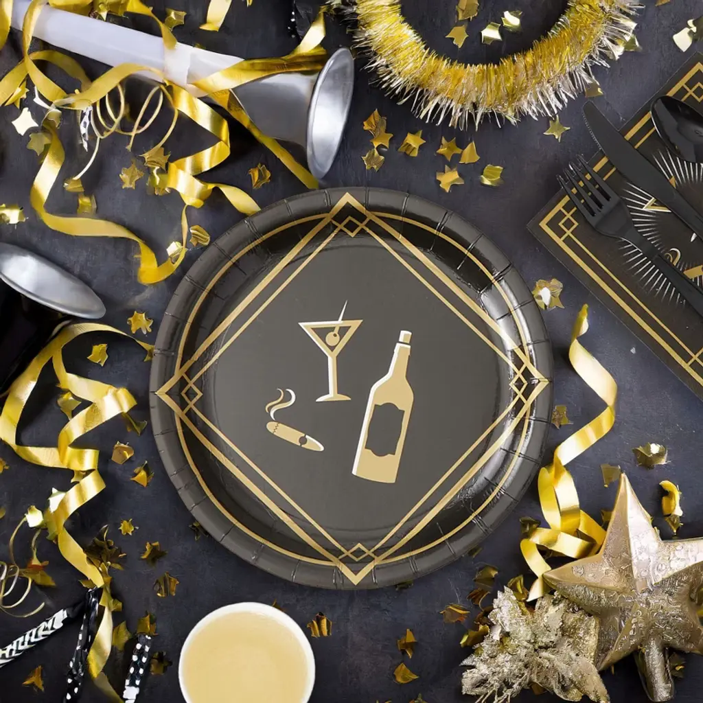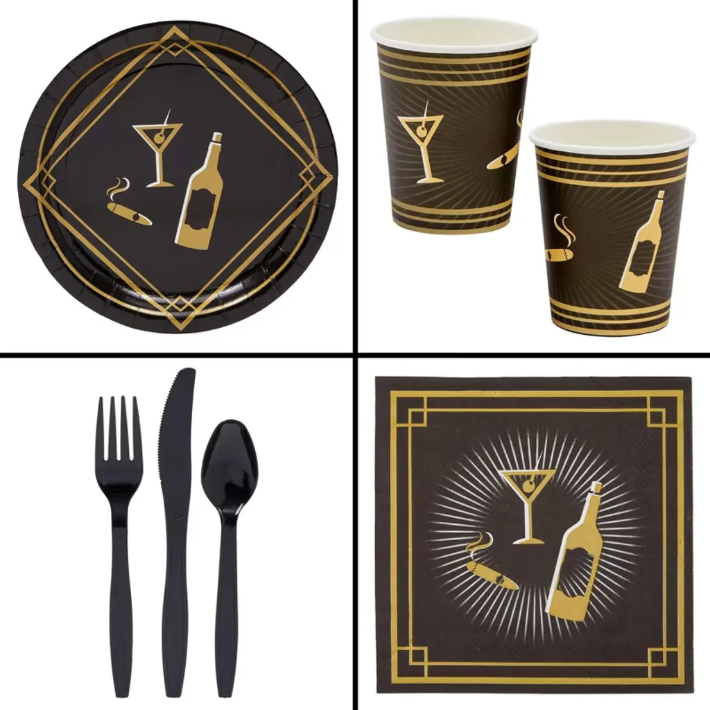 Add this 144-piece disposable dinnerware set to your roaring 20s decorations! The set includes 24 of the following: plates, napkins, cups, and plastic silverware. The decorative set has a black background and a picture of a martini glass, cigar, and spirits bottle on the front. It will instantly elevate your dining and dessert tables while creating a cohesive theme throughout your event. Simply add this 1920s decorations and supplies set to create a perfectly coordinated theme for dinner parties, cocktail parties, New Year's Eve, rehearsal dinners, engagement parties, weddings, birthdays, holiday celebrations, and anniversary parties! Warning. Do not Microwave.
