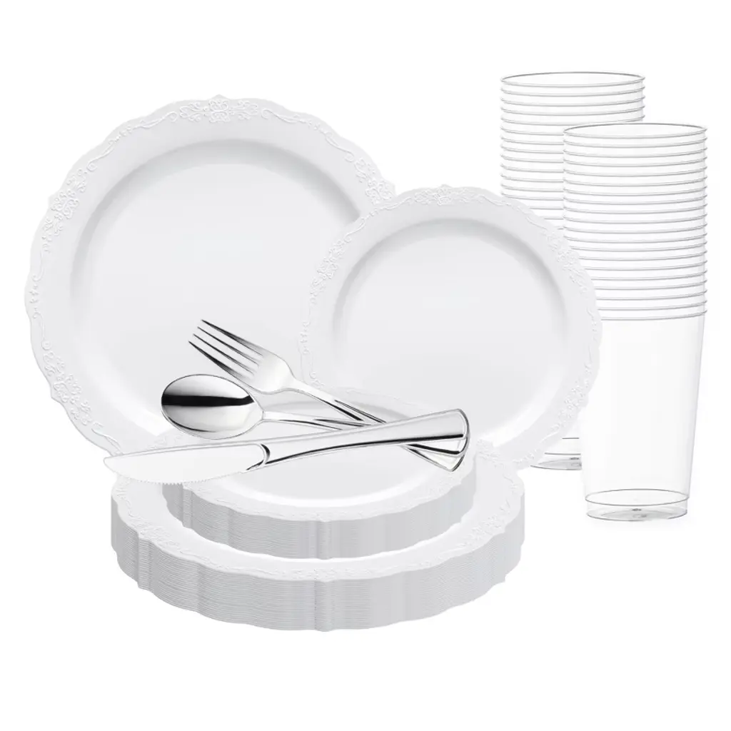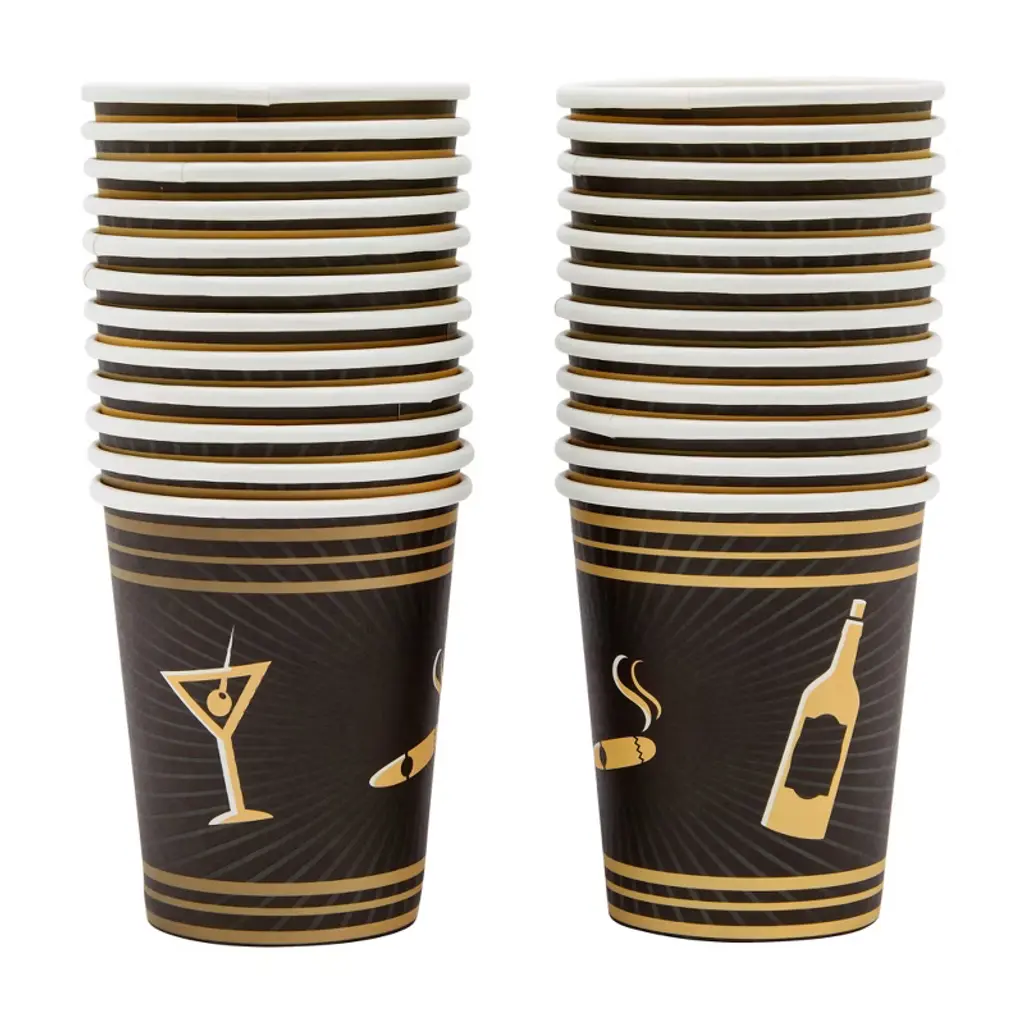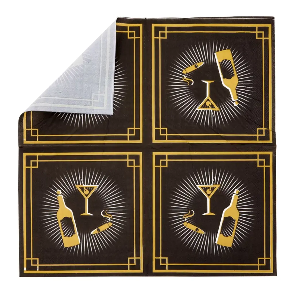 Add this 144-piece disposable dinnerware set to your roaring 20s decorations! The set includes 24 of the following: plates, napkins, cups, and plastic silverware. The decorative set has a black background and a picture of a martini glass, cigar, and spirits bottle on the front. It will instantly elevate your dining and dessert tables while creating a cohesive theme throughout your event. Simply add this 1920s decorations and supplies set to create a perfectly coordinated theme for dinner parties, cocktail parties, New Year's Eve, rehearsal dinners, engagement parties, weddings, birthdays, holiday celebrations, and anniversary parties! Warning. Do not Microwave.
