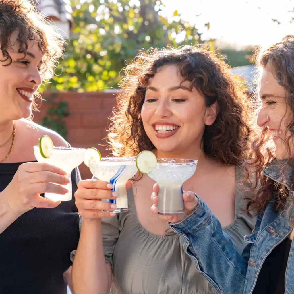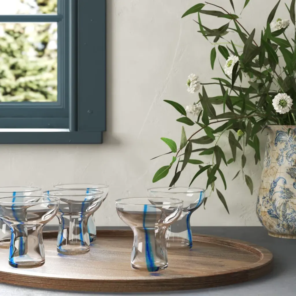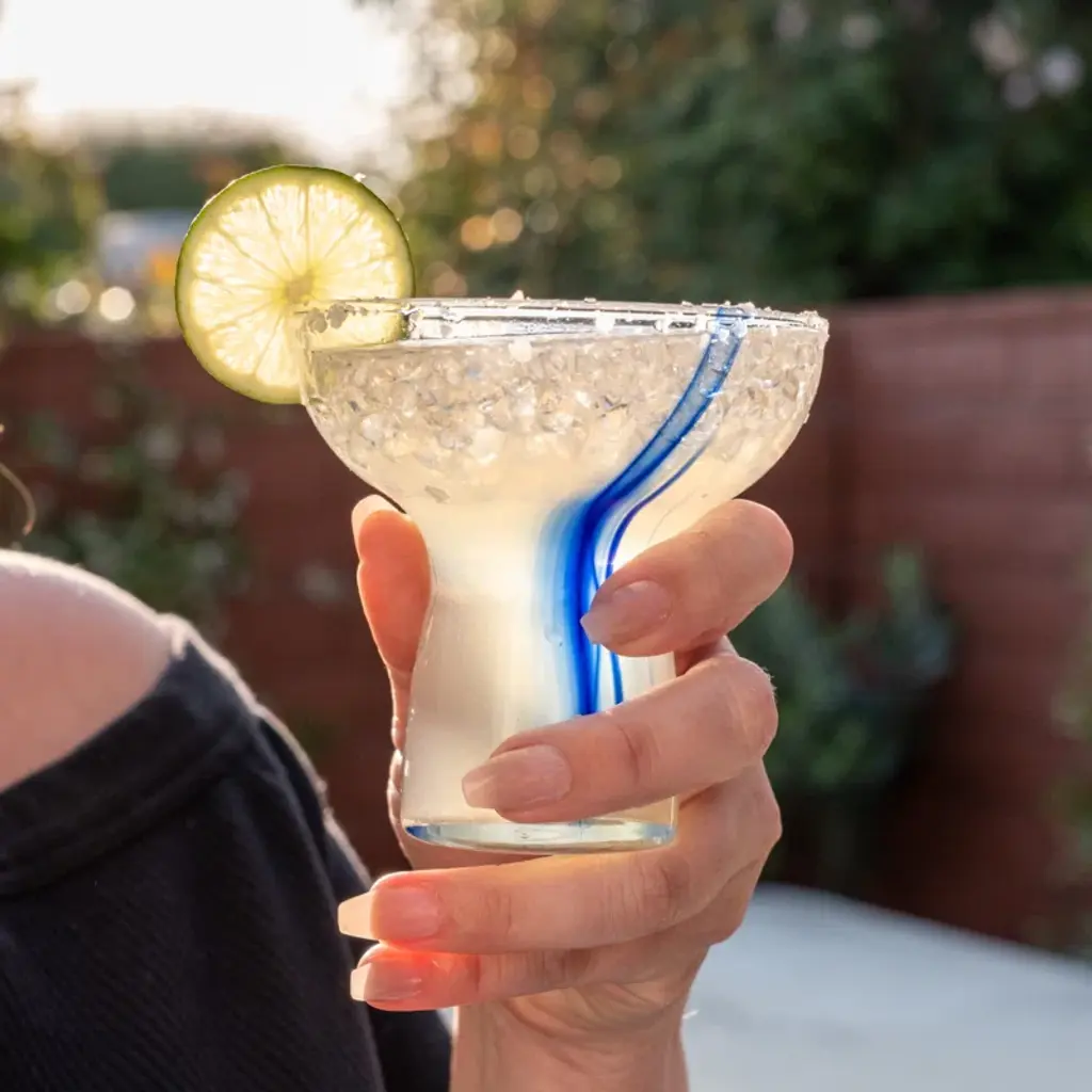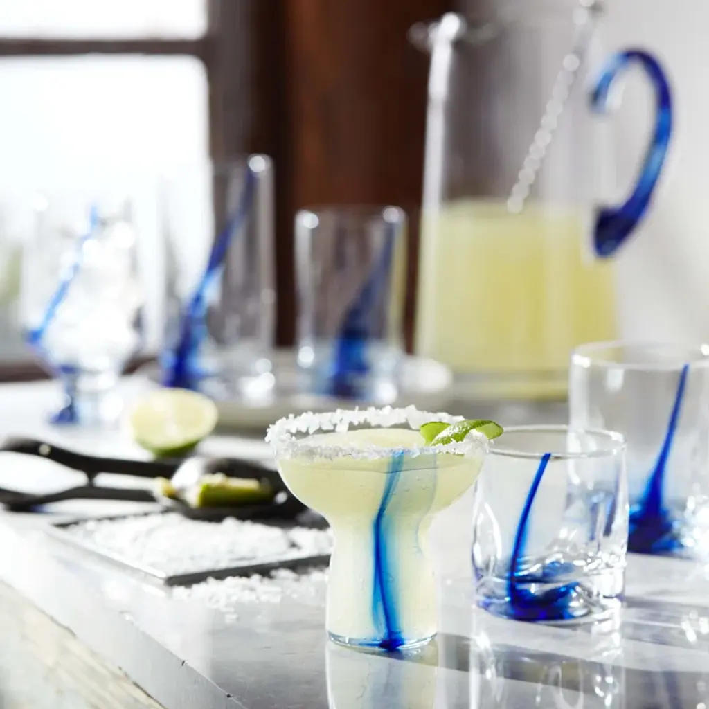 Libbey Margarita Glasses Set of 6: Our stemless fancy margarita glasses are the perfect blend of sophistication and casual grace for your social gatherings! Enhance your margarita indulgence with this set of six modern, clear, short margarita glasses designed for both style and functionality. Crafted with an artisan inspired design featuring a blue streak and a wide rim, these margarita glasses stemless not only showcase your favorite margaritas with a touch of class but also add flair to your dessert presentations. The 10.25-ounce capacity of these sangria glasses ensures just the right amount for a refreshing drink. Designed for convenience, the stemless and lightweight nature of these fun margarita glasses makes them easy to carry without the worry of spills or breakage. The shallow bowl of these pretty cocktail glasses enhances the overall experience, allowing you to savor every sip. Safety is a top priority, and our unique drinking glasses are made from lead and BPA-free glass, ensuring a safe and enjoyable drinking experience for you and your guests. Whether you're hosting an indoor dinner party or an outdoor gathering, these margarita glasses are unique glassware, perfect for any occasion. Cleaning up your margarita glasses is a breeze as they are totally dishwasher-safe. With proper care, this durable margarita set will remain a staple in your glassware collection for years to come - cocktail gifts for you to enjoy yourself or with friends and family