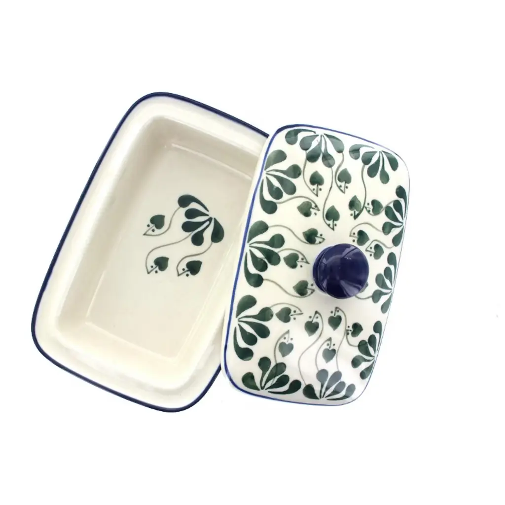 Add both charm and versatility to your kitchen with our handmade and hand-painted butter tub, crafted in Poland by skilled artisans. Measuring 6.75 inches by 5 inches, this generously sized tub is ideal for storing butter. Each piece is decorated with traditional hand-painted patterns, making every tub a unique work of functional art that brings color and authenticity to your table or countertop. Crafted from durable stoneware, it is designed for everyday use and is safe for the microwave, dishwasher, and freezer, combining timeless craftsmanship with modern convenience. Whether used at breakfast, tea time, or as part of your entertaining setup, this butter tub adds beauty, function, and artisanal charm to your home.