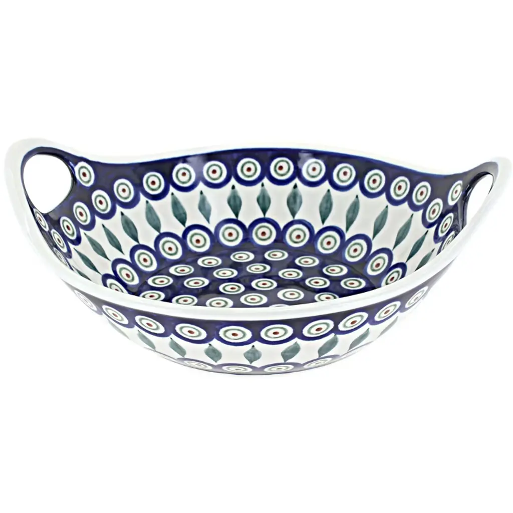 Egg Plate - perfect to showcase your deviled eggs! Holds 12 eggs perfectly - and is easy to store as well! 9" diameter The Art of Polish Pottery, as we know it today, started as local folk art centuries ago in the German province of Silesia. The first known pieces of “Bunzlauer” stoneware dating back to the 16th century were crafted by hand and decorated with a folk art stamping technique using potatoes. Original designs were inspired by the peacock feather using the colors of cobalt blue, sage green and ferrous red. These designs and colors are still the inspiration for modern day patterns.Today, skilled Polish artists still individually handcraft and hand decorate each piece using small sponges to stamp each pattern and color. After the process of mixing ingredients, molding the pottery, applying the decorations and glaze, the pottery is twice fired. This process makes the pottery extremely durable, it will not crack or chip easily, and it is perfect for use in the microwave, dishwasher, oven and freezer. Along with our pottery, we have sourced a range of absolutely beautiful hand blown glassware from Poland. It is the perfect addition to your Polish Pottery Collection!