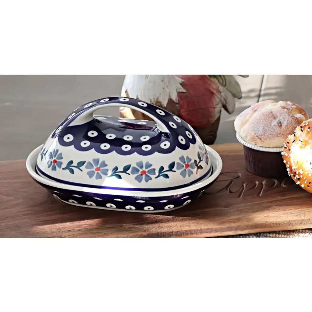 Keep your butter fresh and your table stylish with our handmade and hand-painted butter dish, crafted in Poland by skilled artisans. Designed for both beauty and function, this dish features a sturdy handle on the lid for easy lifting, and a base that measures 7 inches by 5 inches, with an interior space of 5 inches by 3.25 inches—perfectly sized to hold a standard stick or block of butter. Each dish is decorated with vibrant, traditional hand-painted patterns, making every piece a unique work of functional art that brightens any kitchen or table setting. Made from durable stoneware, this butter dish is built to last and is safe for the microwave, dishwasher, and freezer, combining authentic craftsmanship with everyday convenience. Whether for daily family meals, entertaining guests, or adding to your collection, this butter dish brings timeless charm, elegance, and practicality to your home.