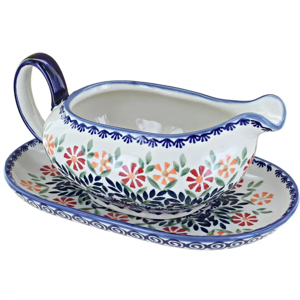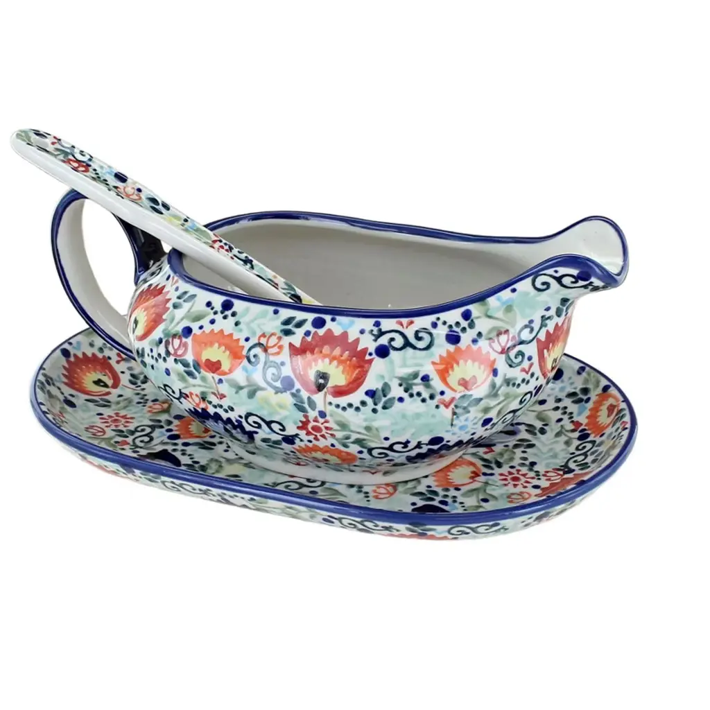 Elevate your table with this classic gravy boat and matching plate set, an essential addition for both everyday meals and holiday gatherings. With a 1.5-cup capacity, the gravy boat is perfectly sized for serving gravies, sauces, or even sweet additions like warm chocolate or caramel. The included underplate, measuring 8.25" x 5.5", not only adds elegance but also catches drips and spills, keeping your table neat and polished. Together, they make a timeless duo that’s as functional as it is beautiful. Each piece is handmade and hand-painted in Poland, featuring vibrant, detailed patterns that transform a serving essential into a one-of-a-kind treasure. Crafted from durable, high-fired stoneware, this set is celebrated for its strength, excellent heat retention, and resistance to chips and scratches, ensuring it will serve your table for years to come. Safe for the microwave, dishwasher, and freezer, it blends heirloom-quality craftsmanship with modern convenience. Whether used for holiday feasts, weekend breakfasts, or special desserts, this gravy boat with matching plate brings both artistry and practicality to your dining experience.