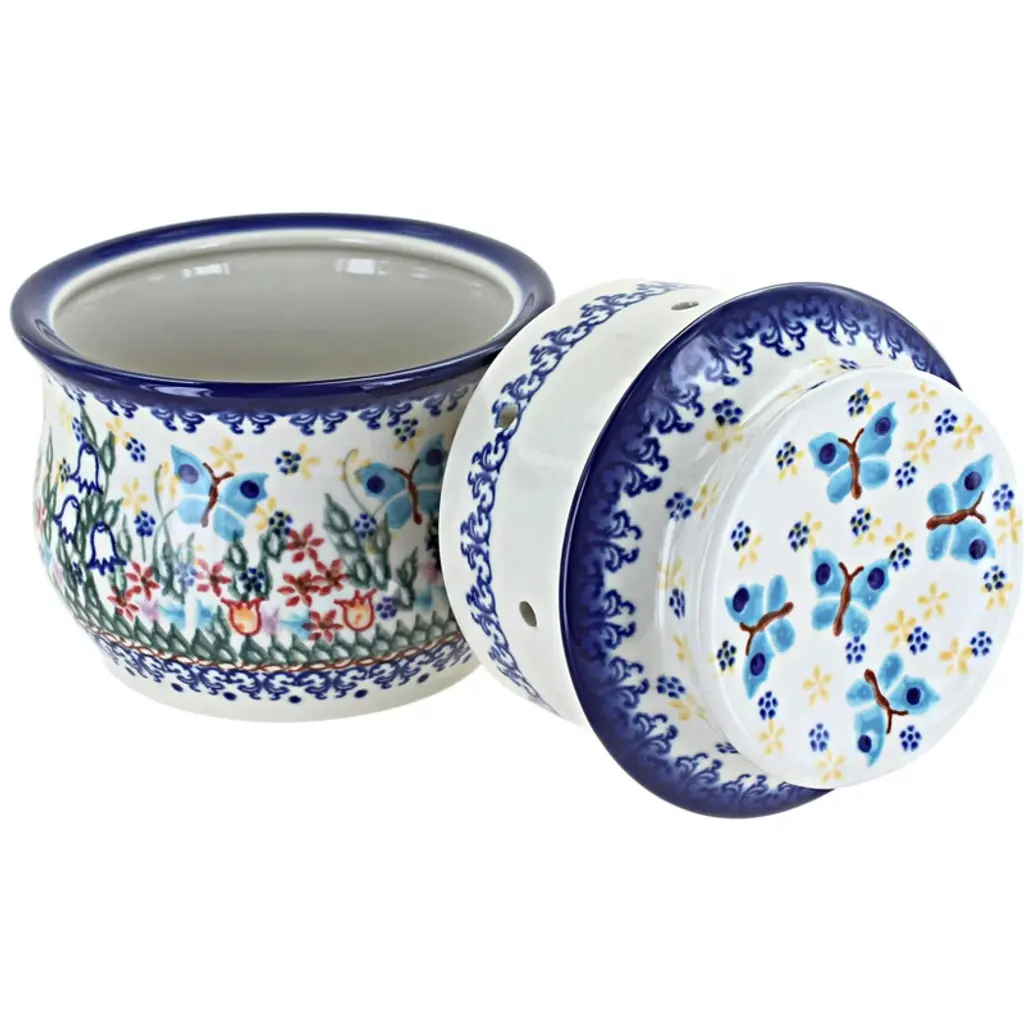 Handcrafted French butter dish keeps butter soft and fresh out on the counter for up to a month. Great for morning pastries or evening breads. Each piece is hand painted for an artisan finish. Dishwasher safe. 4.5 inches wide x 4.25 inches tall. The Art of Polish Pottery, as we know it today, started as local folk art centuries ago in the German province of Silesia. The first known pieces of “Bunzlauer” stoneware dating back to the 16th century were crafted by hand and decorated with a folk art stamping technique using potatoes. Original designs were inspired by the peacock feather using the colors of cobalt blue, sage green and ferrous red. These designs and colors are still the inspiration for modern day patterns.Today, skilled Polish artists still individually handcraft and hand decorate each piece using small sponges to stamp each pattern and color. After the process of mixing ingredients, molding the pottery, applying the decorations and glaze, the pottery is twice fired. This process makes the pottery extremely durable, it will not crack or chip easily, and it is perfect for use in the microwave, dishwasher, oven and freezer. Along with our pottery, we have sourced a range of absolutely beautiful hand blown glassware from Poland. It is the perfect addition to your Polish Pottery Collection!
