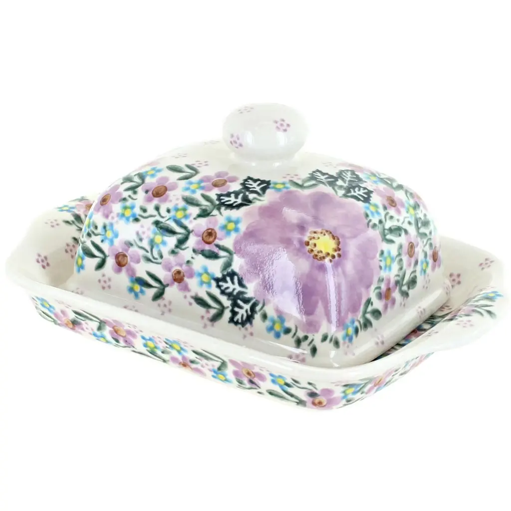 Our covered dish keeps butter fresh for starting your morning or passing around the dinner table. Each piece is hand crafted and painted for an artisan finish. Dishwasher safe. Bottom Dish is 5 inches x 8 inches. Inside section for butter is 5 inches x 3inches. The Art of Polish Pottery, as we know it today, started as local folk art centuries ago in the German province of Silesia. The first known pieces of “Bunzlauer” stoneware dating back to the 16th century were crafted by hand and decorated with a folk art stamping technique using potatoes. Original designs were inspired by the peacock feather using the colors of cobalt blue, sage green and ferrous red. These designs and colors are still the inspiration for modern day patterns.Today, skilled Polish artists still individually handcraft and hand decorate each piece using small sponges to stamp each pattern and color. After the process of mixing ingredients, molding the pottery, applying the decorations and glaze, the pottery is twice fired. This process makes the pottery extremely durable, it will not crack or chip easily, and it is perfect for use in the microwave, dishwasher, oven and freezer. Along with our pottery, we have sourced a range of absolutely beautiful hand blown glassware from Poland. It is the perfect addition to your Polish Pottery Collection!