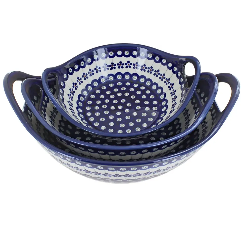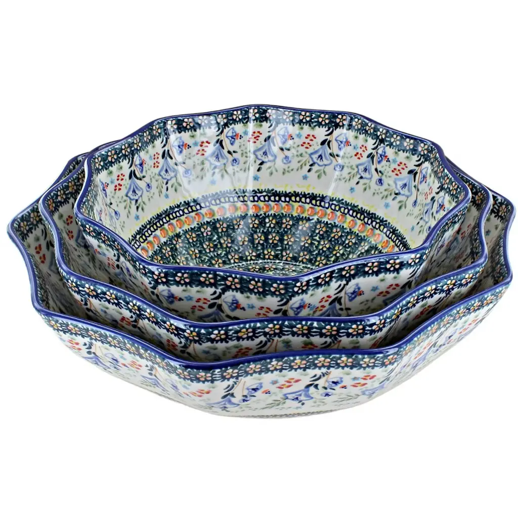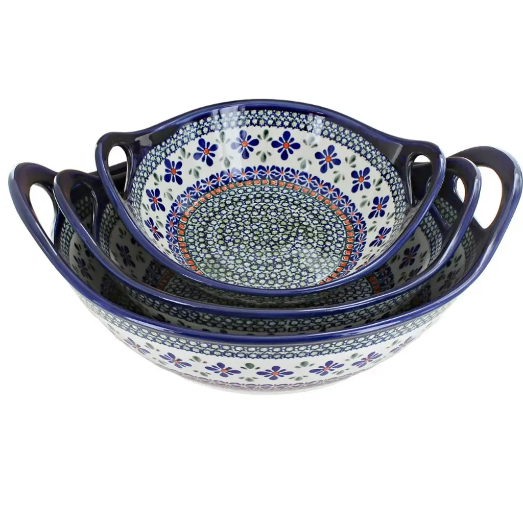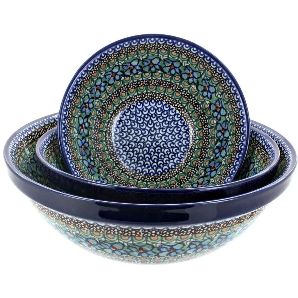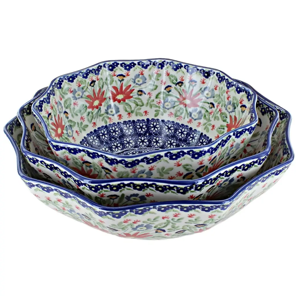 Our most unusual shape, this decagonal (10-sided) serving bowl set is a striking and versatile addition to your collection. The set includes three sizes: a large bowl (11.5" diameter x 3.5" deep) perfect for salads, pastas, or serving a main dish; a medium bowl (10.5" diameter x 4" deep) ideal for vegetables, sides, or fruit; and a small bowl (9" diameter x 4" deep) that works beautifully for dips, snacks, or desserts. Together, these bowls create a coordinated serving set that’s as functional as it is eye-catching. The geometric shape makes them stand out on any table, while their generous depth ensures practicality for both entertaining and everyday meals. Each bowl is handmade and hand-painted in Poland, decorated with vibrant, intricate patterns that highlight centuries of artisan tradition. Crafted from durable, high-fired stoneware, they resist chips and scratches, offering exceptional quality designed to last for years. Safe for the oven, microwave, dishwasher, and freezer, these bowls combine heirloom-level artistry with modern convenience. Whether used individually or as a nested set, this decagonal trio is a unique and elegant way to serve your favorite dishes.