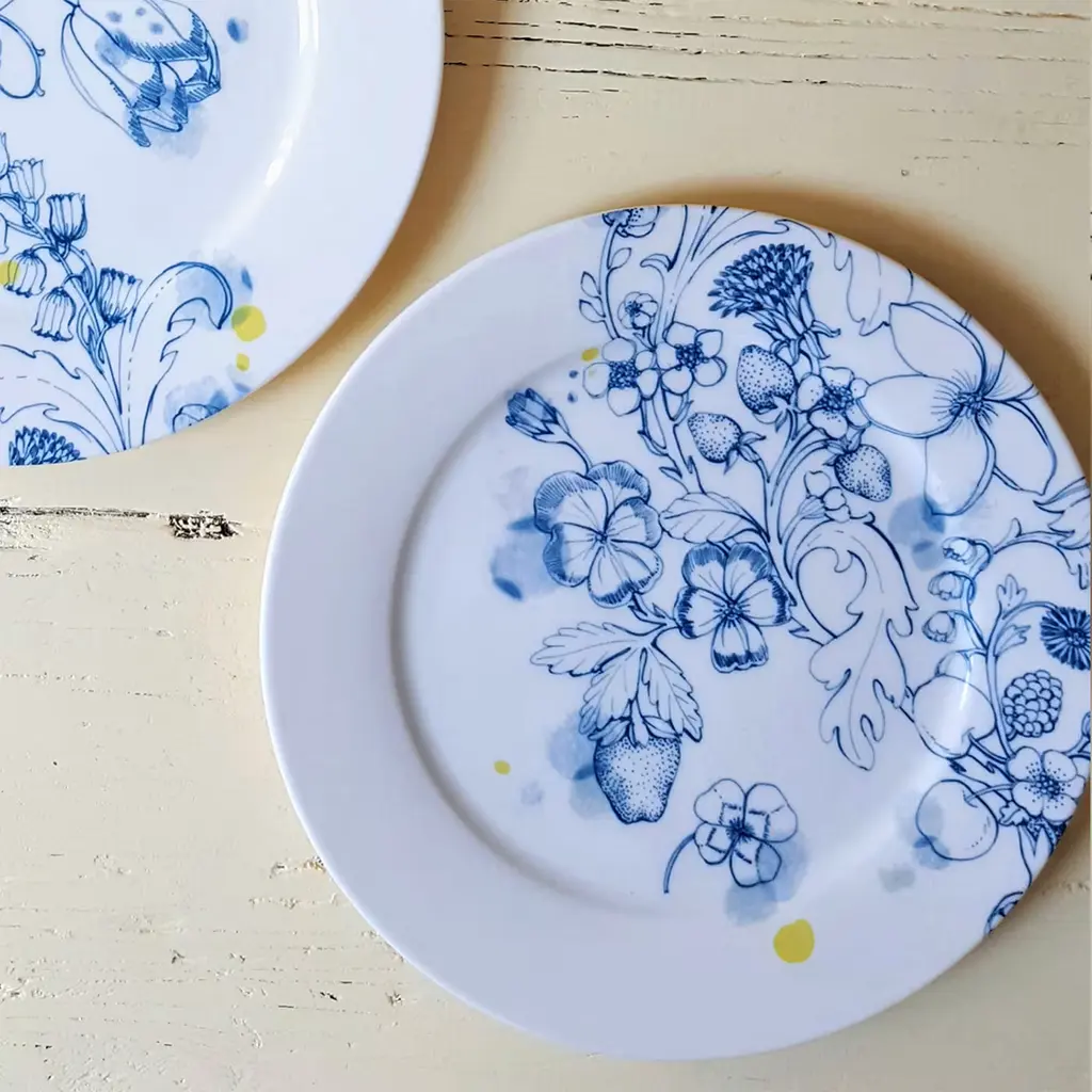 The "Blue Summer Collection" is a contemporary reinterpretation of the traditional white and blue Delft porcelains. Its motifs are an elegant balance of wild fruits and flowers into a fresh exquisite ornamental design. The smooth tones of blue with some highlight touches of yellow gave a contemporary twist to all the designs. Each design varies slightly due to the manual techniques used in their manufacturing. Oven and dishwasher are safe.