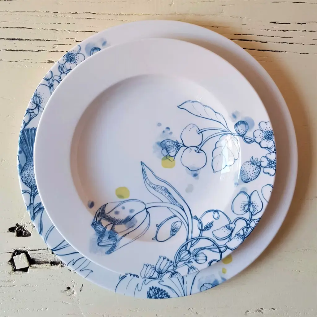 The "Blue Summer Collection" is a contemporary reinterpretation of the traditional white and blue Delft porcelains. Its motifs are an elegant balance of wild fruits and flowers into a fresh exquisite ornamental design. The smooth tones of blue with some highlight touches of yellow gave a contemporary twist to all the designs. Each design varies slightly due to the manual techniques used in their manufacturing. Oven and dishwasher are safe.