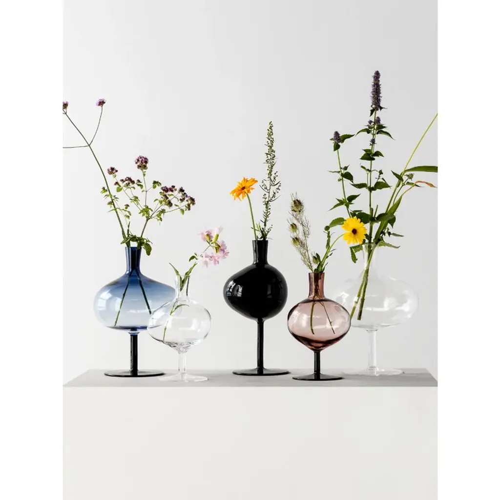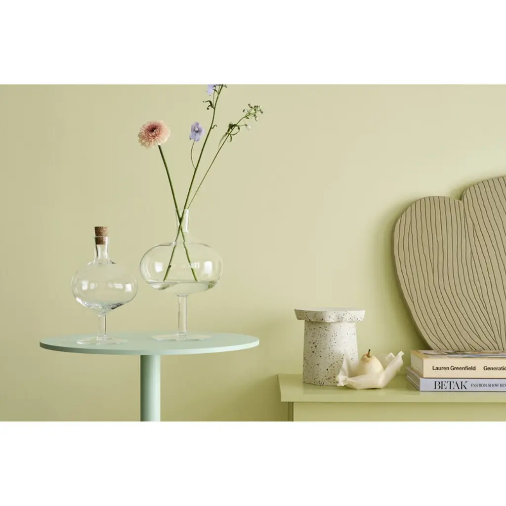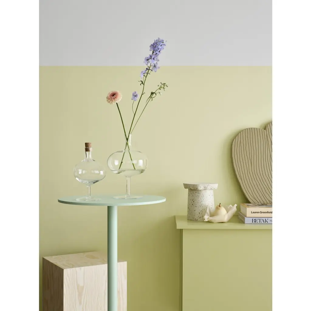 Kosta Boda's Bod bottle charms with its soft form and asymmetrical shape. Mouth-blown from recycled crystal glass, the bottle's design is not only esthetic and elegant, but also a salute to the many years of wine glass production at the Kosta Boda glassworks. The Bod glass bottle serves as a vase for tiny flowers and stems or simply as a decorative ornament on its own. The cork cap finishes the bottle’s stylish look. The Bod bottle was designed by designer brothers Matti and Simon Klenell.