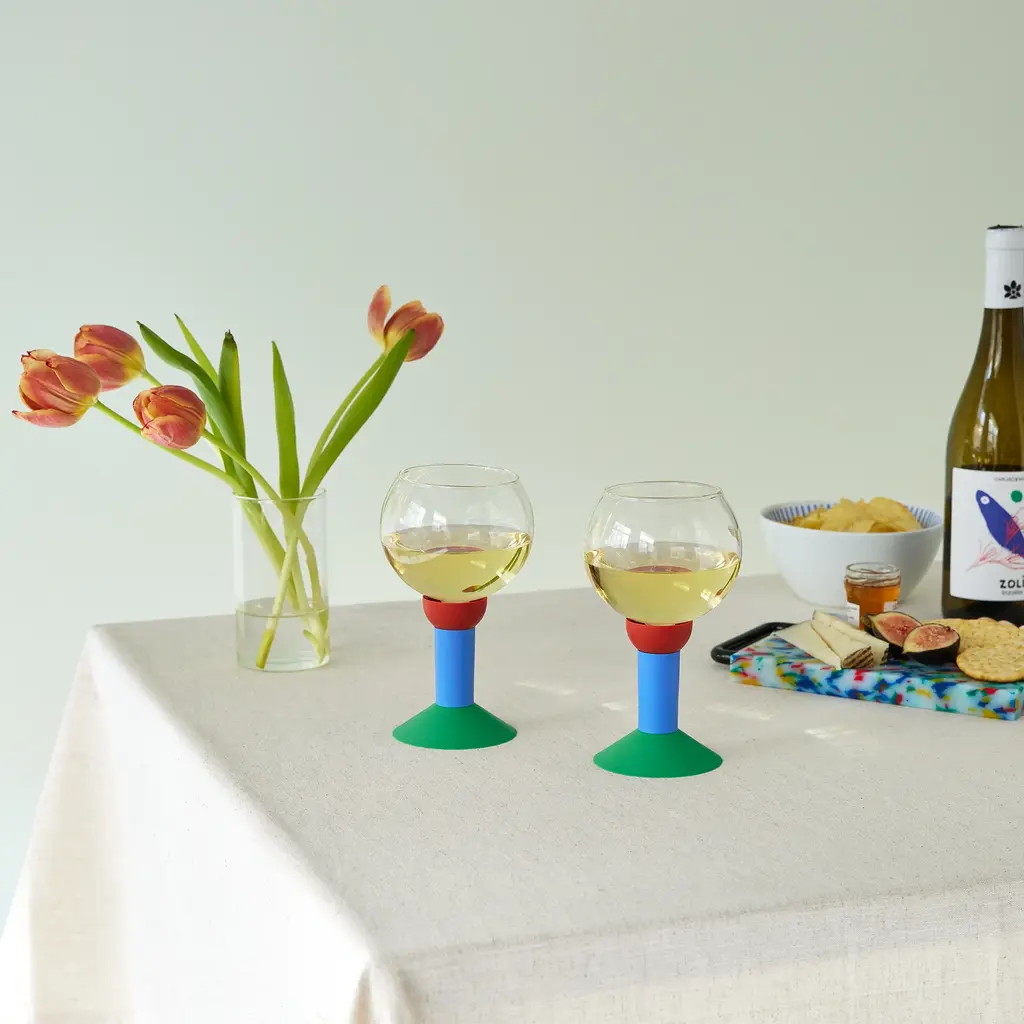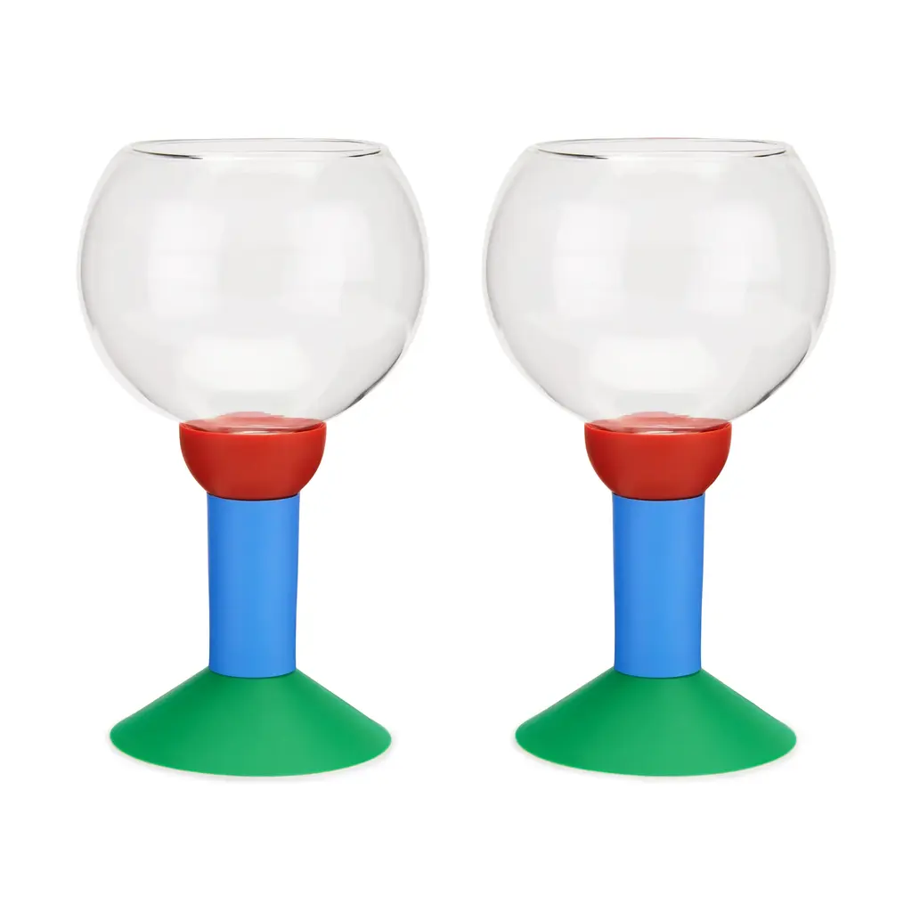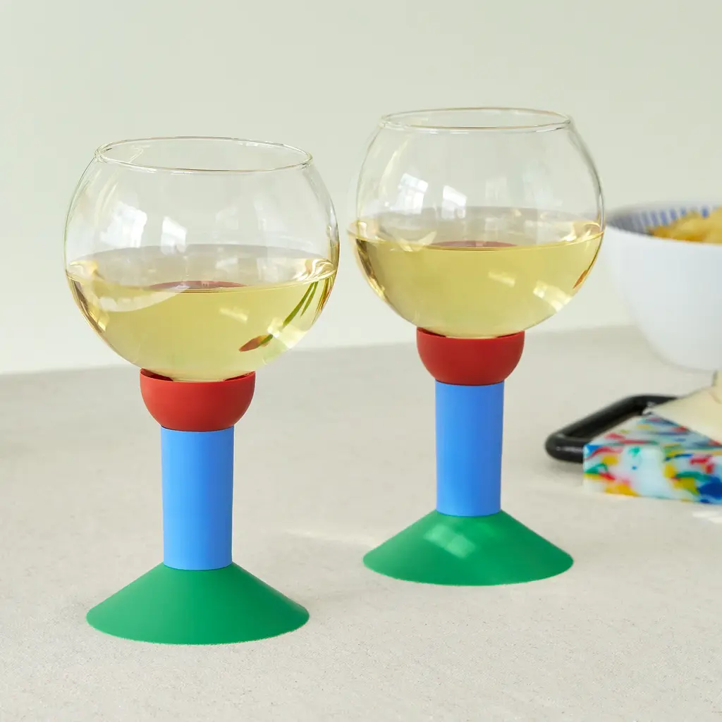 MoMA Exclusive: These reissued, postmodern glassware designs from 1983 are sure to garner attention at your next cocktail gathering or dinner party. Produced by Bodum, this set of two Oktett Wine Glasses feature chunky, colorful bases made from recycled plastic, with glass vessels.
