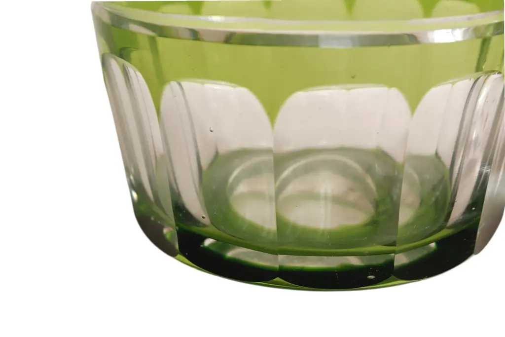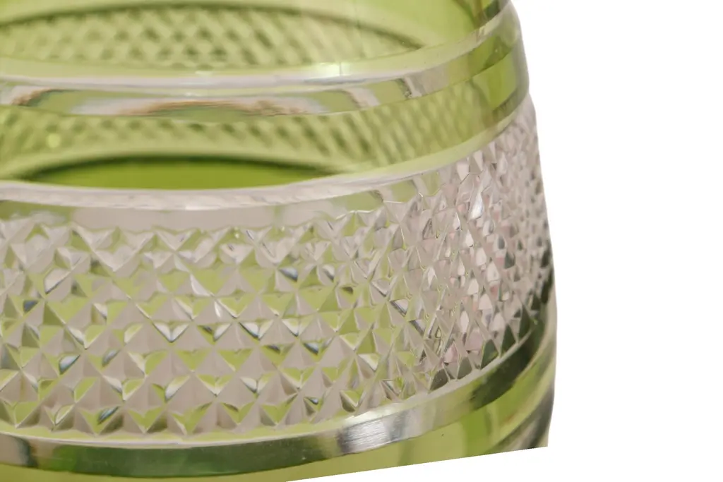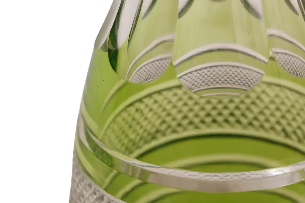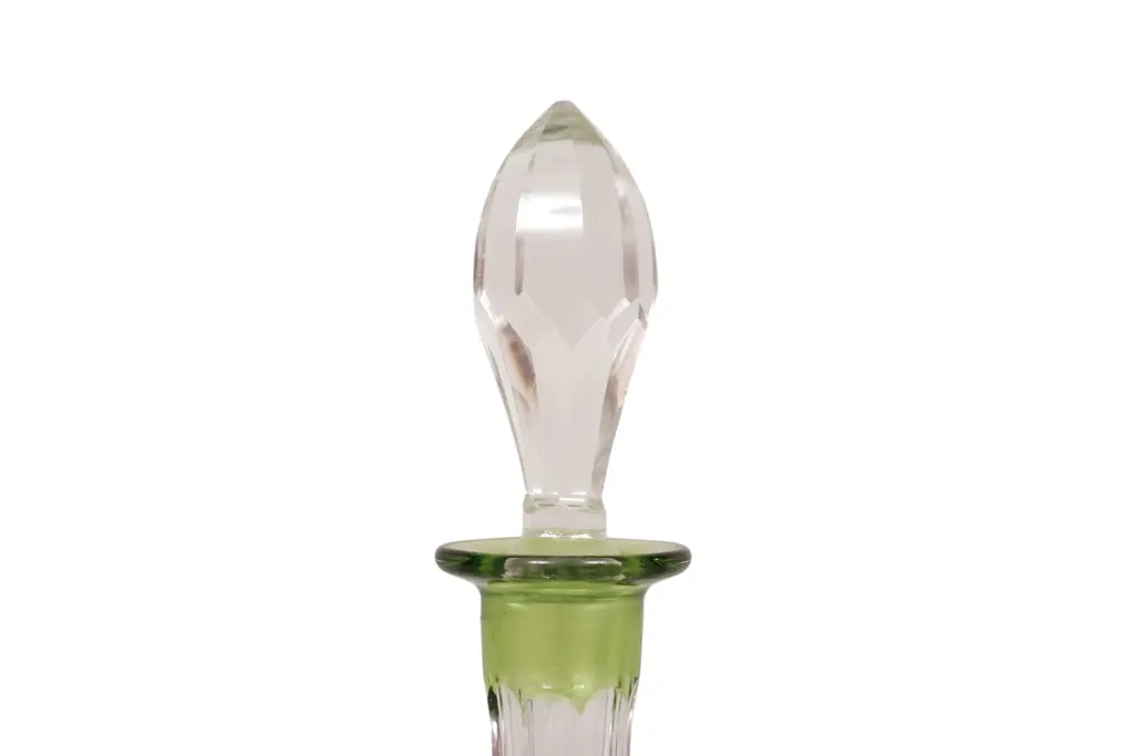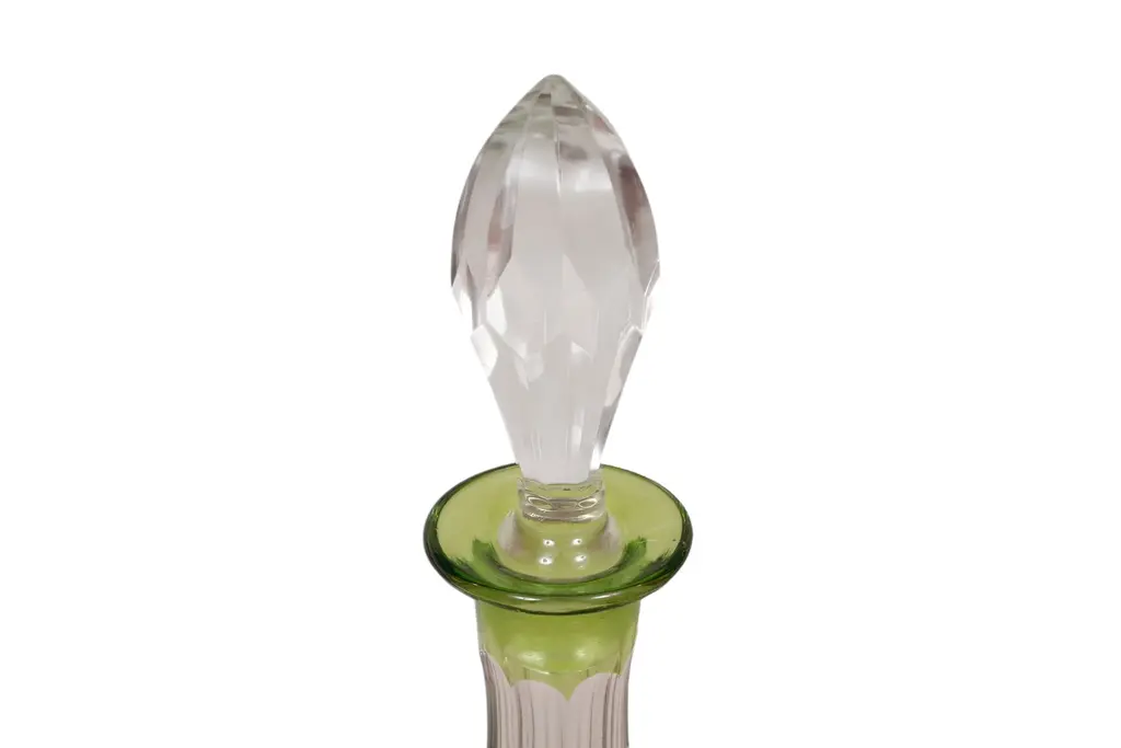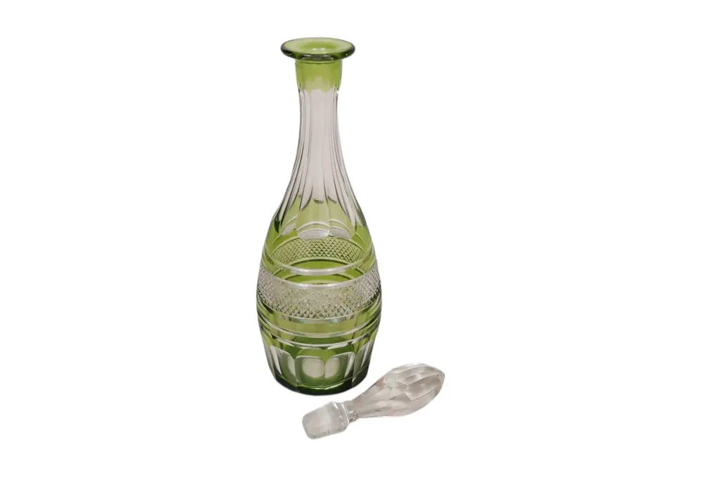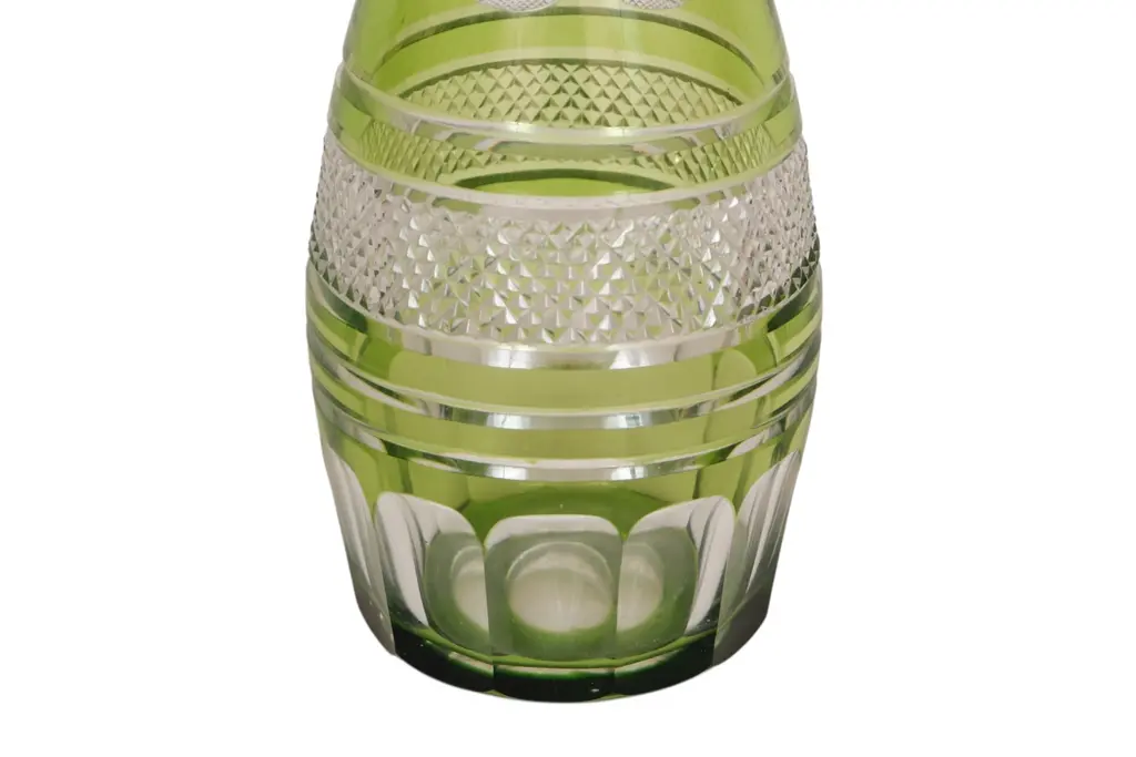 A Bohemian cut glass decanter in olive green. Decorated with a diamond cut band framed with beveled lines, and fluting on the neck and around the base.