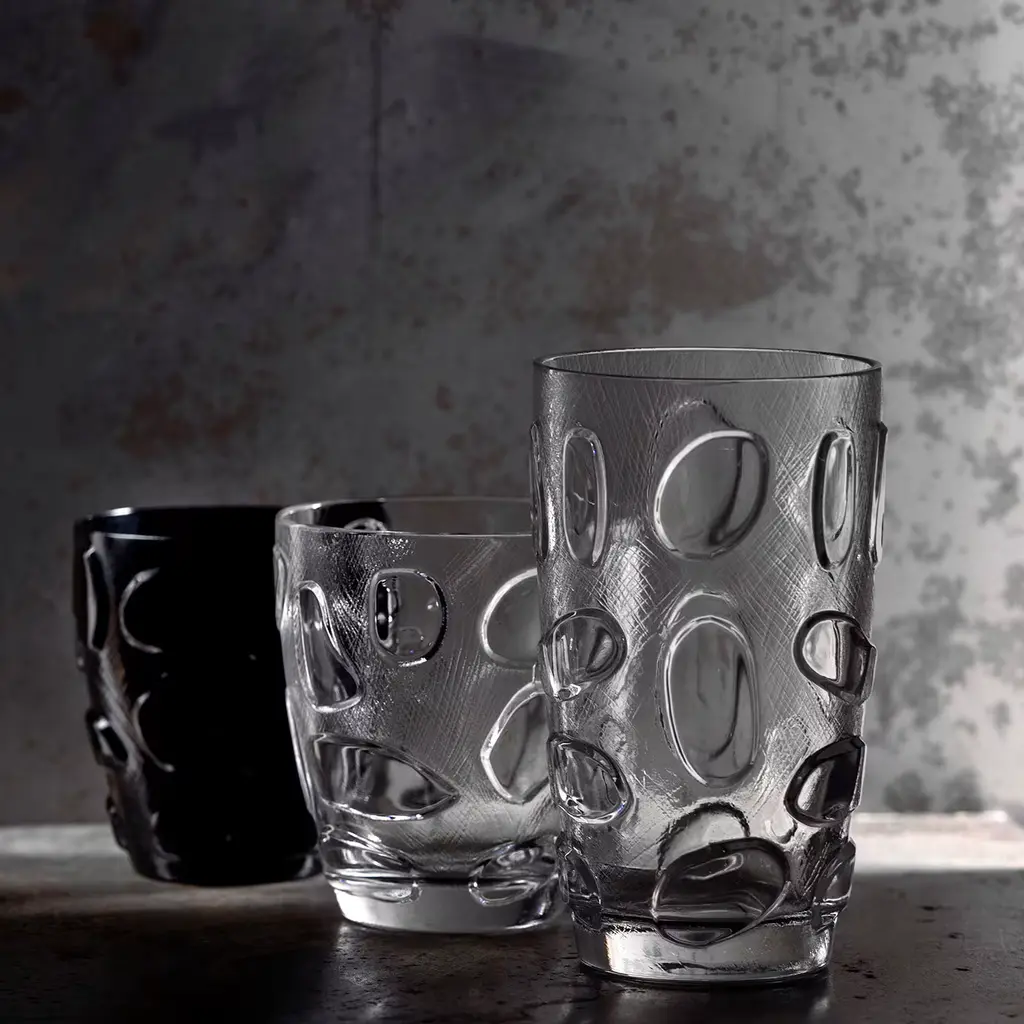Designed in 2004 by Michele De Lucchi with Alberto Nason and part of the Bolle Collection, this set of two highball glasses is a versatile and precious addition to a contemporary interior, where it can be used for dinner or cocktails to serve chilled drinks while also imbuing an organic and dynamic flair to any occasion, thanks to the relief irregular bubbles that grace its surface. These handmade, mouth-blown pieces measure each H 150 x Ø 84 mm, with a capacity of 35 cl and are made by hand of mouth-blown crystal.