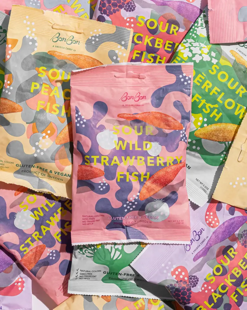 With great pride and joy, BonBon presents its newly expanded collection of sweet and sour fish. Crafted in Sweden, these vegan, gluten-free confections are naturally colored. Gift-wrapped in a classic pink box and hand-tied with a coordinating ribbon Flavors include: Sour Peach Fish, Sour Blackberry Fish, Sour Elderflower Fish, Sour Strawberry Fish, Sweet Wild Strawberry Fish, Licorice Mix, Sour Mix, and Sweet Mix Refrigerated Shelf Life: 12 months Package Dimension: 12" x 4" x 10" Net Weight: 72 oz./ 2041.2 g Made in Sweden Declared allergens: Tree nut traces and glutenContains allergens: Tree_nut_traces and gluten undefined