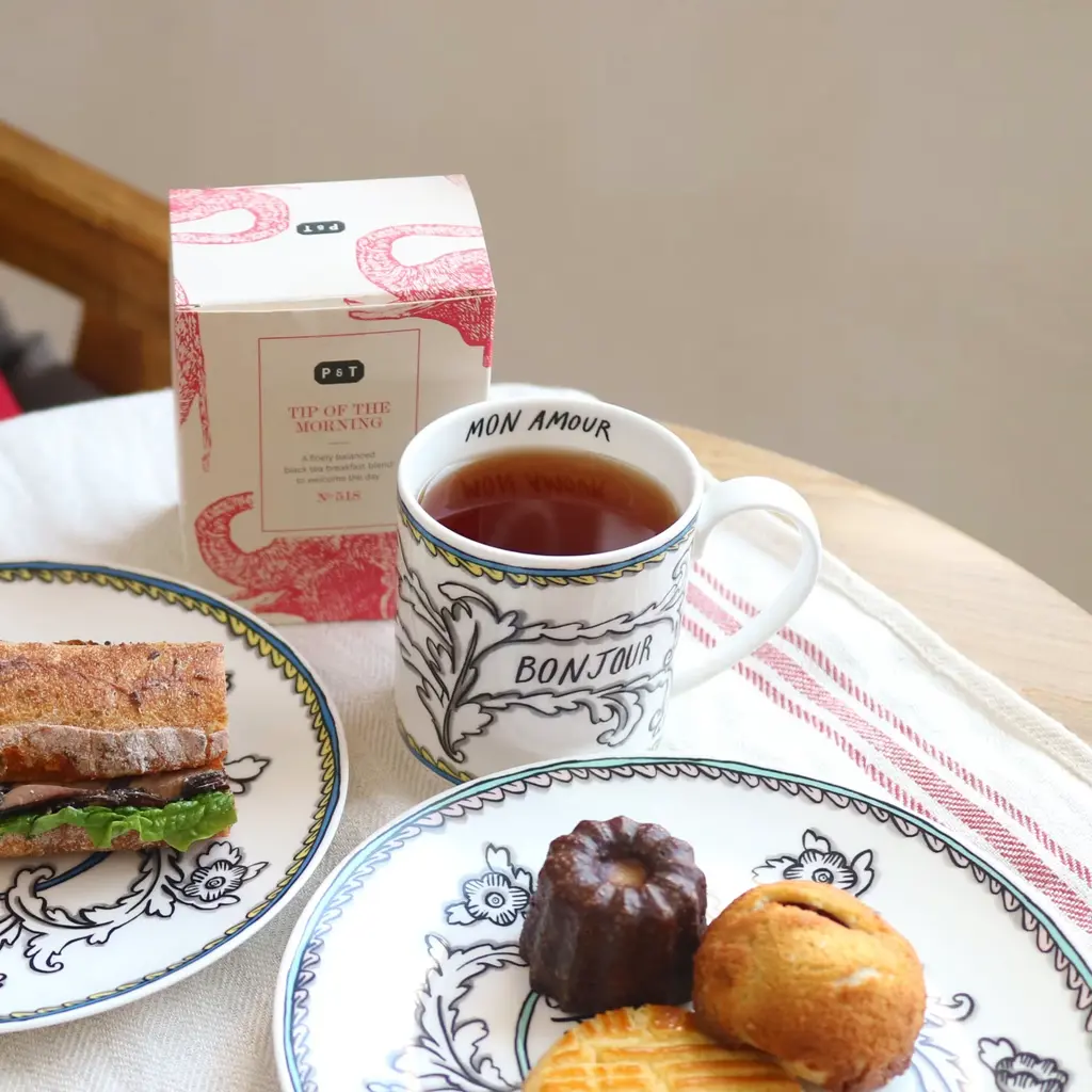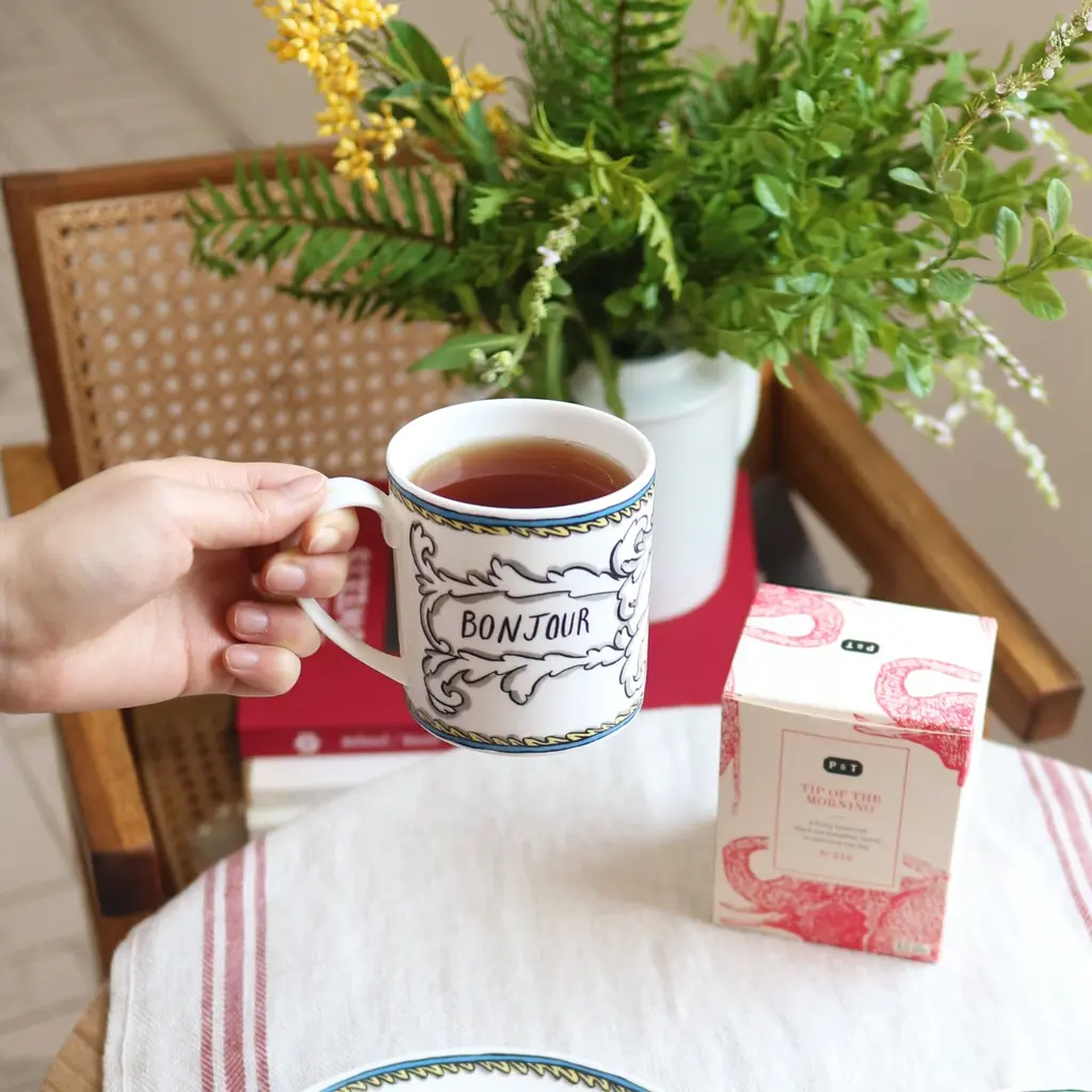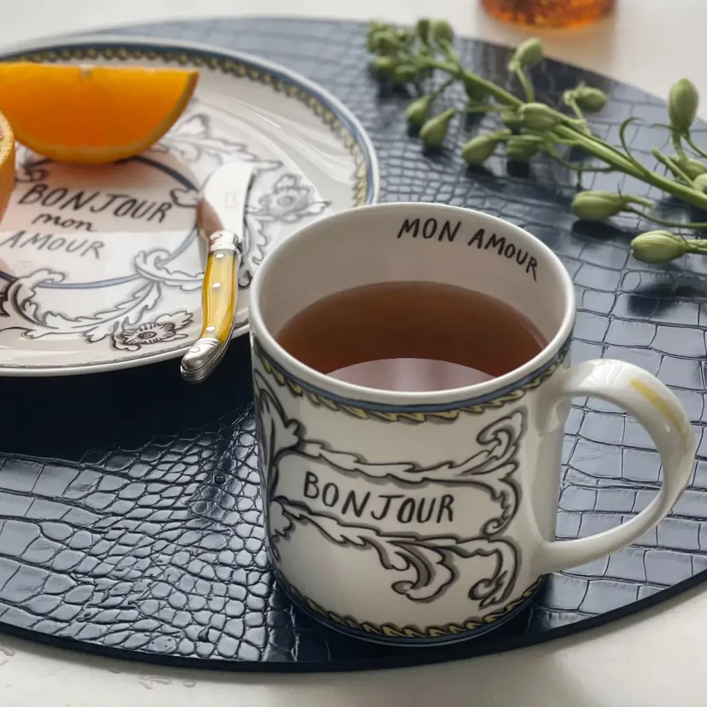 The Enjoy & Mon Amour Collection in collaboration with Molly Hatch. This collection focuses on Molly’s love of inspirational quotes presented in the graphic quality of black and white. With a touch of a shadow inspired by Dutch Delft surfaces and pops of color in the borders, this collection is truly unique.Ideal for Coffee or TeaOne mug per boxFine Bone China with hand applied decalMug: 3.25 in. x 3.5 inDishwasher and Microwave safeEnjoy & Bonjour Collection