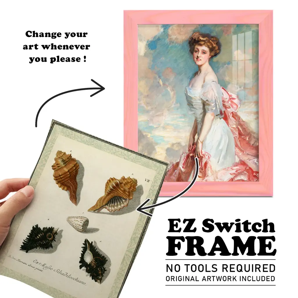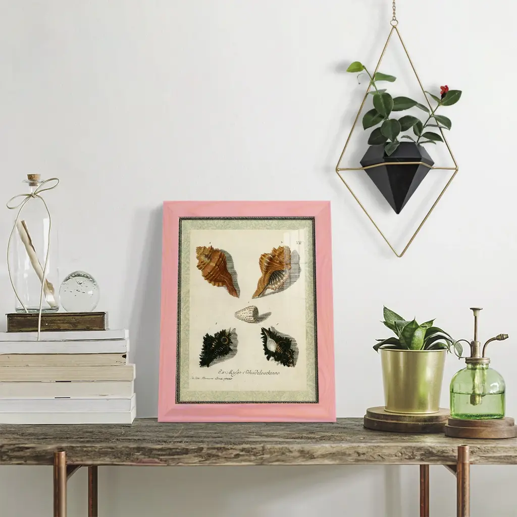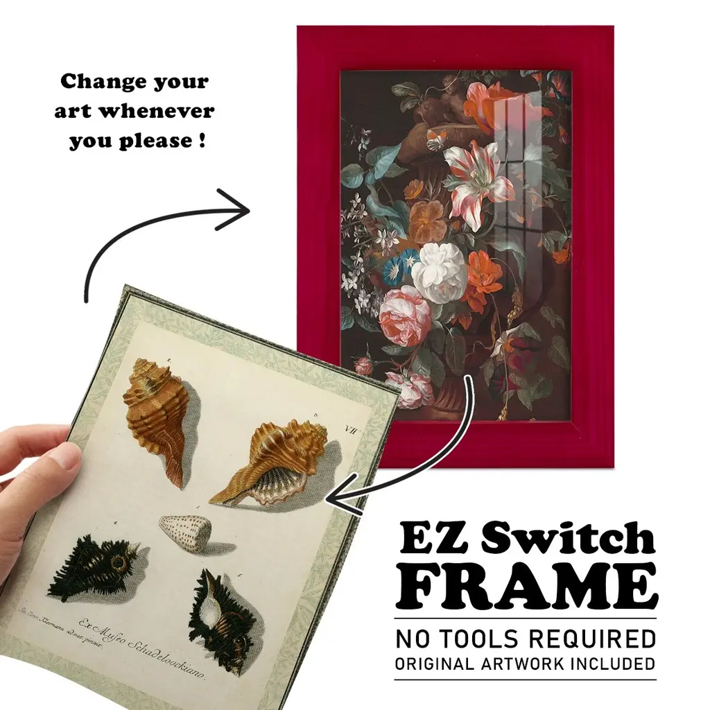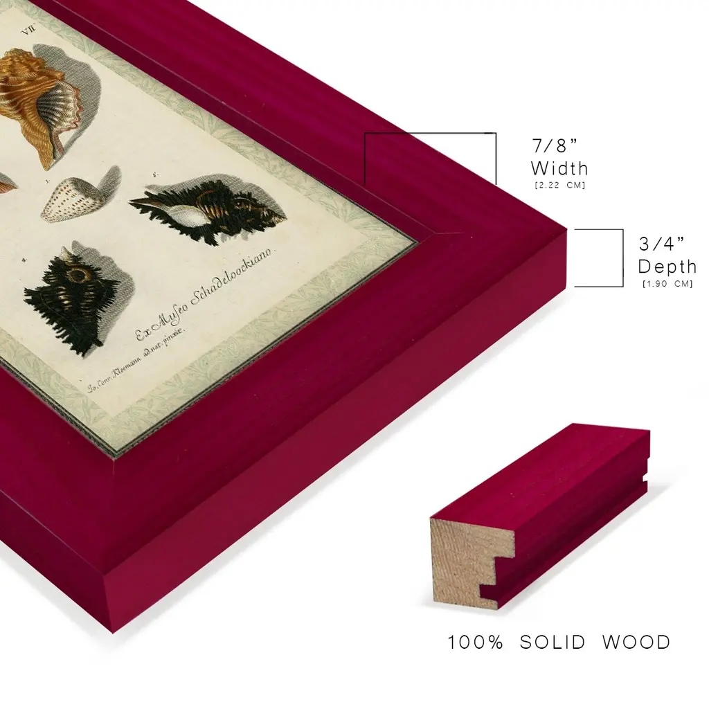 Bookplate Shells I -EZ SWITCH Framed Print w/glass-Cherry Red A delightful, framed print. Featuring a solid wood frame with real wood glass. This premium print is giclee quality. In addition, every frame features a removable back and table top stand. This allows you to change your art in the future or to just stand the art on a table for a new look. We are sure you'll enjoy our new series of EZ SWITCH Framed Art. Solid Wood Frame Real Glass Removable / Replaceable Art Built in Tabletop Stand Sizes range from 4x6 up to 12x15 - buy just one or pair them up as sets as you see fit.