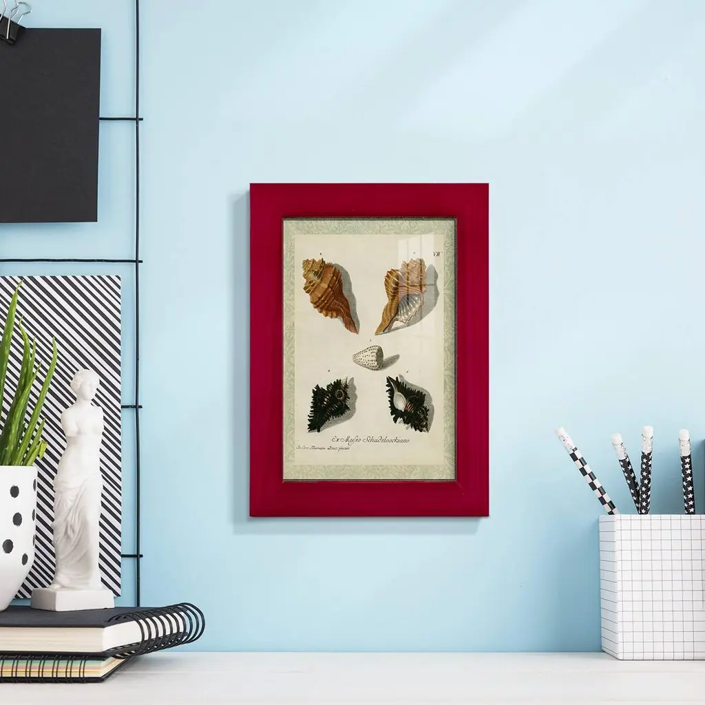 Bookplate Shells I -EZ SWITCH Framed Print w/glass-Cherry Red A delightful, framed print. Featuring a solid wood frame with real wood glass. This premium print is giclee quality. In addition, every frame features a removable back and table top stand. This allows you to change your art in the future or to just stand the art on a table for a new look. We are sure you'll enjoy our new series of EZ SWITCH Framed Art. Solid Wood Frame Real Glass Removable / Replaceable Art Built in Tabletop Stand Sizes range from 4x6 up to 12x15 - buy just one or pair them up as sets as you see fit.