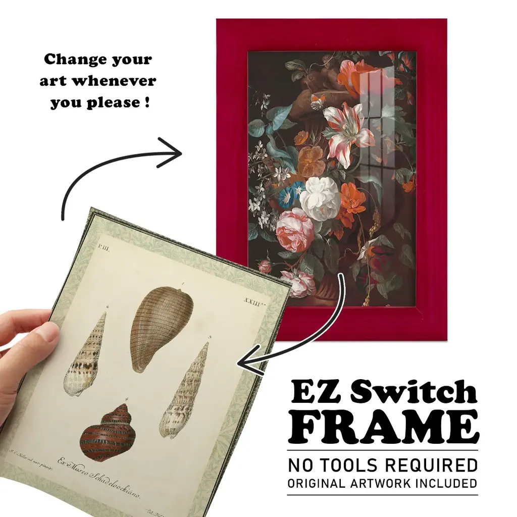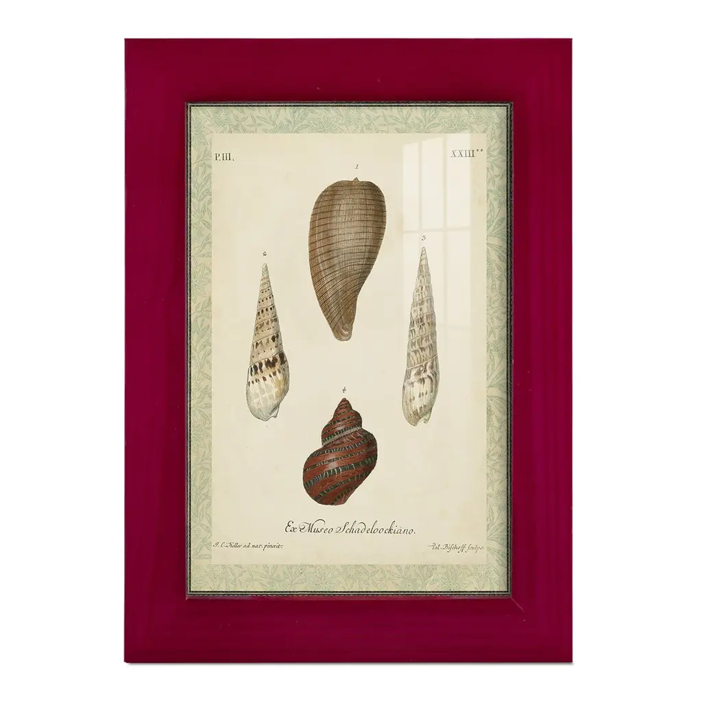 Bookplate Shells V -EZ SWITCH Framed Print w/glass-Cherry Red A delightful, framed print. Featuring a solid wood frame with real wood glass. This premium print is giclee quality. In addition, every frame features a removable back and table top stand. This allows you to change your art in the future or to just stand the art on a table for a new look. We are sure you'll enjoy our new series of EZ SWITCH Framed Art. Solid Wood Frame Real Glass Removable / Replaceable Art Built in Tabletop Stand Sizes range from 4x6 up to 12x15 - buy just one or pair them up as sets as you see fit.