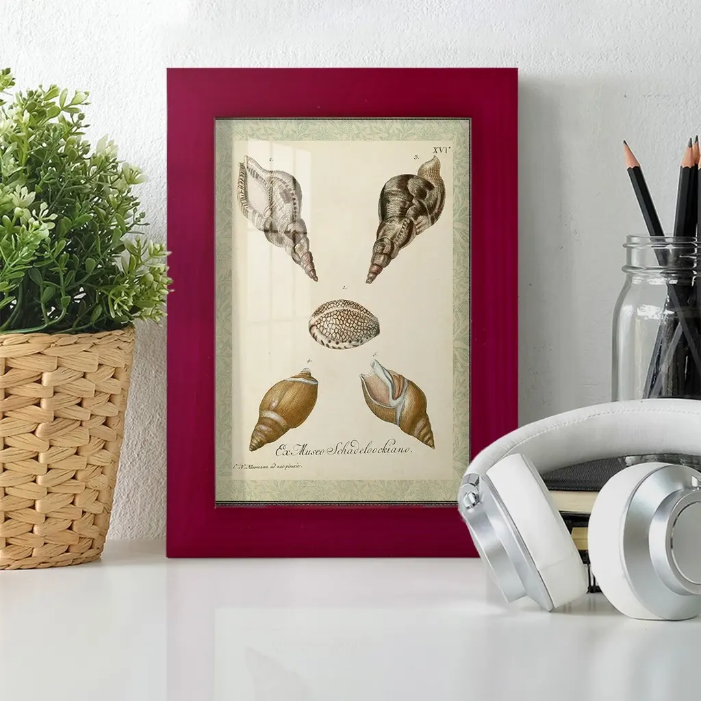 Bookplate Shells VIII -EZ SWITCH Framed Print w/glass-Cherry Red A delightful, framed print. Featuring a solid wood frame with real wood glass. This premium print is giclee quality. In addition, every frame features a removable back and table top stand. This allows you to change your art in the future or to just stand the art on a table for a new look. We are sure you'll enjoy our new series of EZ SWITCH Framed Art. Solid Wood Frame Real Glass Removable / Replaceable Art Built in Tabletop Stand Sizes range from 4x6 up to 12x15 - buy just one or pair them up as sets as you see fit.