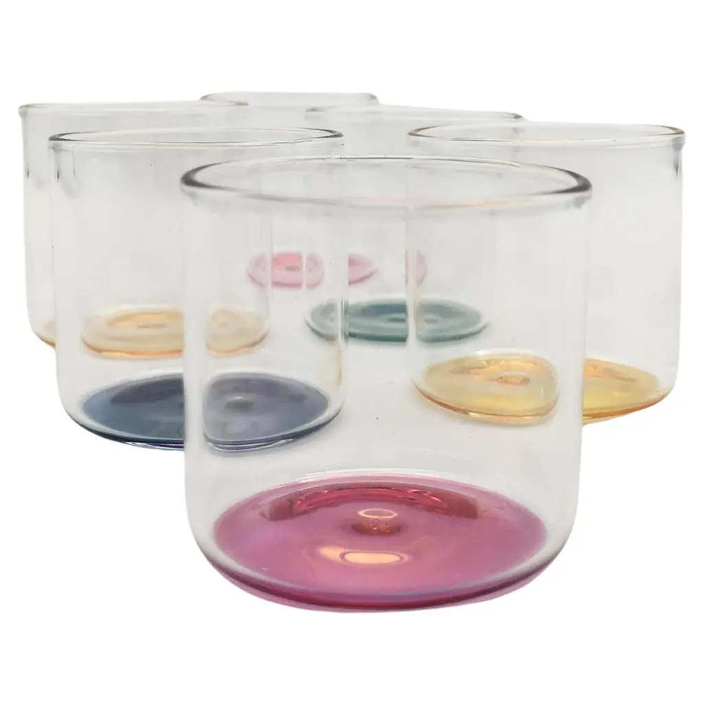 Slightly tilted, as if under a gust of bora wind, this set of six superb Murano crystal glasses is a splendid addition to a contemporary dining room, where each of them will enliven any occasion with their distinctive decorations. The oval cross-section of each piece is adorned with traditional "murrine" and "cannette," gold and silver leaf details, spots, bands, rings, and spiral patterns in red and blue. The glasses are signed and dated and measure 102 H x 94 Ø mm. The set is dishwasher safe.