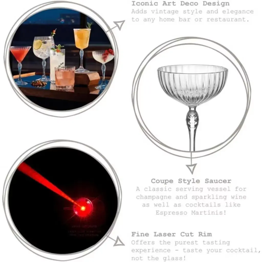 This glass is part of an elegant 1920’s-inspired collection, which brings the glamour of trendy American jazz bars through to today: where conversation was about art and the ambiance was of unprecedented newness and enthusiasm. The Cocktail Coupe model, which has a capacity of 23 cl ( 7 3/4 oz) shows an elegant and sinuous design: the stem of the glass is embellished with a decorated drop motif, while the cup is crossed by dense facets that create intriguing light effects.