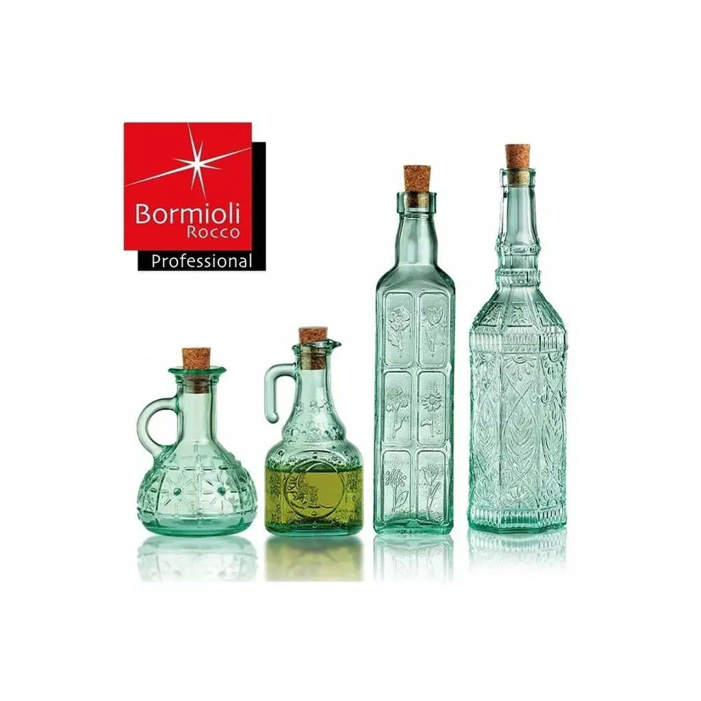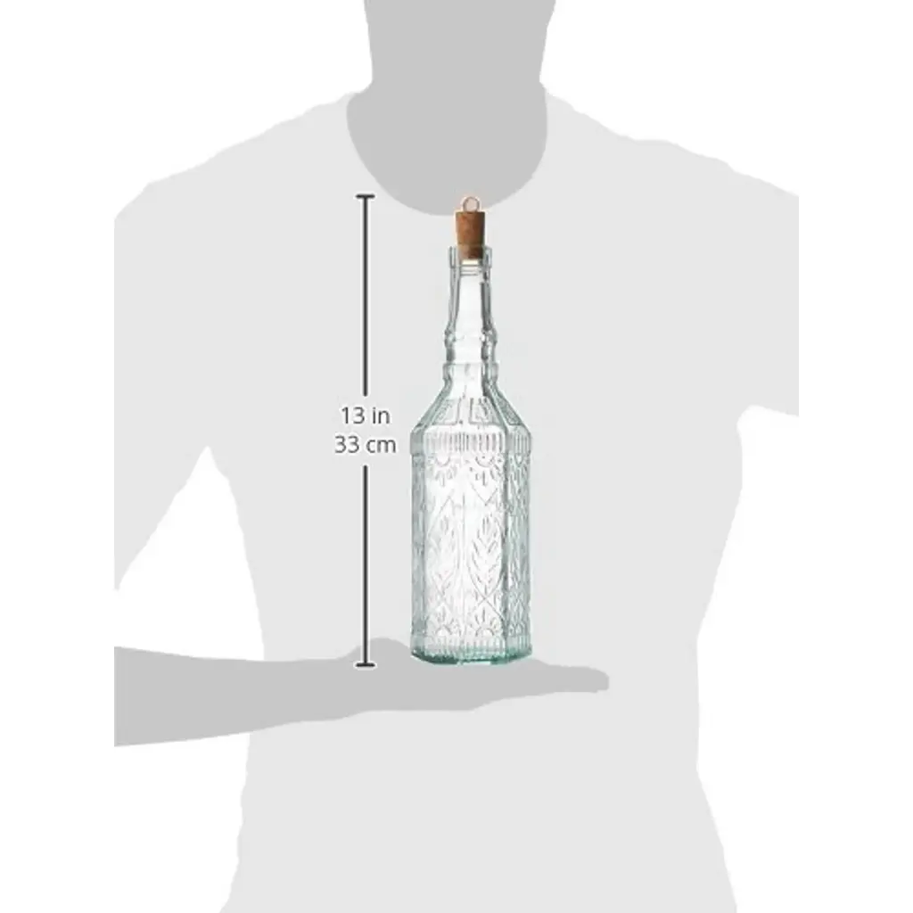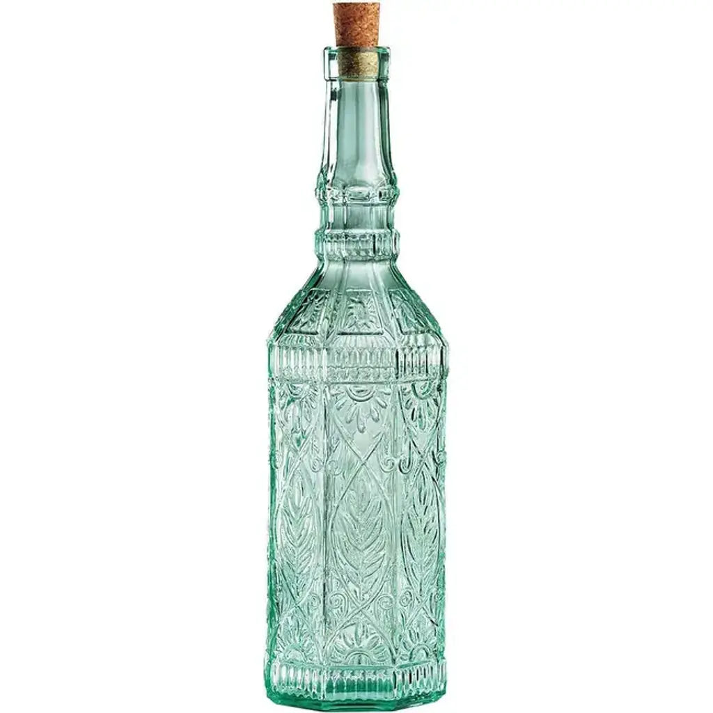 Bormioli Rocco Country Home Fiesole Bottles - NewStore oil, vinegar, and more with elegance using the Country Home Assisi bottle! Made of beautiful blue-green tinted glass, this elegant bottle, which has a capacity of 71 cl (24 oz), is entirely covered by an elegant and complex floral decoration with a pleasantly retro style. The classic cork stopper ensures the contents stay fresh. The bottle is therefore perfect for storing and dispensing condiments, but also for decorating, or creating a unique gift. Dishwasher-safe product. Lid not microwave safe. Lid not washable. The bottle is not suitable for containing carbonated drinks.FEATURES:COLOR:MATERIAL:WHAT'S IN THE BOX:PACKAGING: Retail Packaging