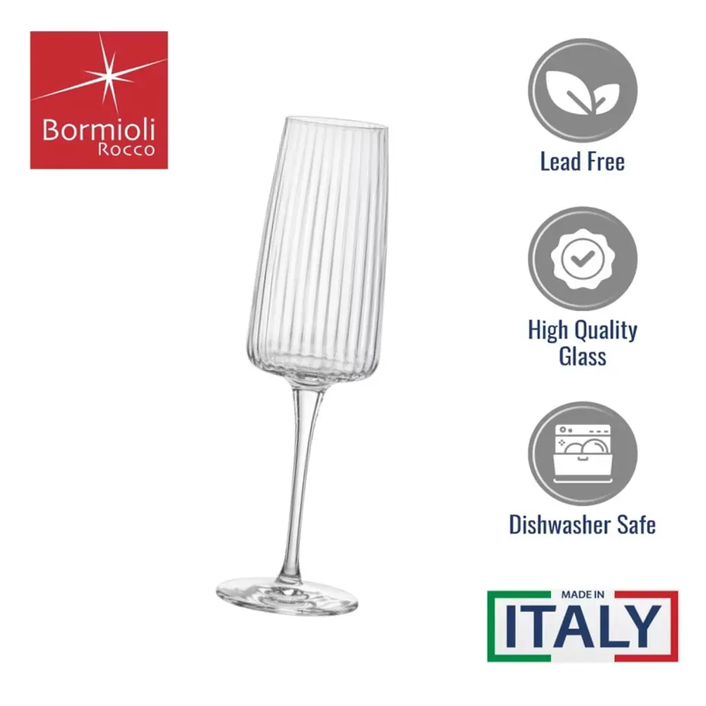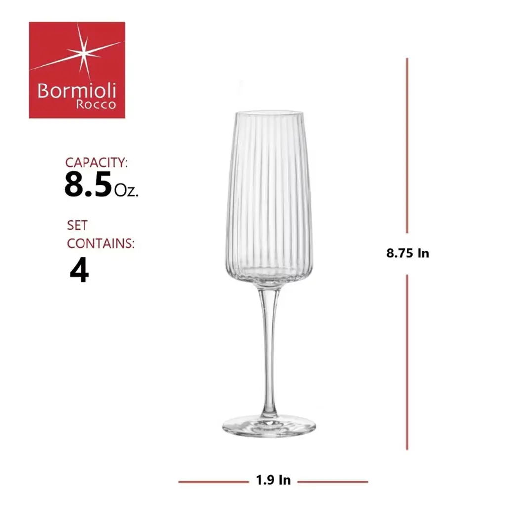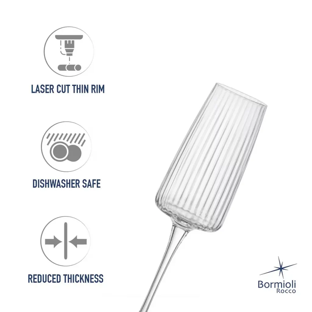 Bormioli Rocco Exclusiva Prosecco Glasses, Set Of 4 - 8.5 Oz. Ribbed Crystal Clear Star Glass With Xlt Stem Reinforcement - Dishwasher Safe