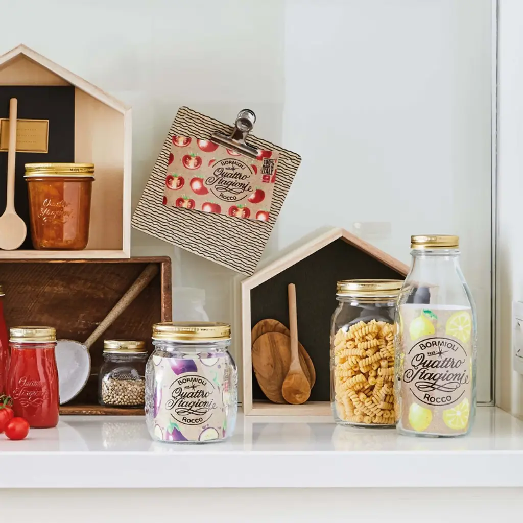 Celebrate the art of gifting and kitchen organization with the Bormioli Rocco Quattro Stagioni 33.75 Oz Glass Bottles, Set of 2. Made in Italy, these versatile jars combine decorative appeal with practical storage, making them ideal for both seasonal gift giving and everyday pantry organization. Each large glass jar is embossed with a beautiful beehive and fresh produce motif, adding a touch of rustic elegance to any setting. The generous 33.75 oz capacity provides space for storing grains, snacks, dried fruit, or beverages, while also offering creative uses for holiday gifts, festive cocktails, floral arrangements, and DIY recipe displays. Equipped with a one-piece twist lid, these airtight bottles ensure reliable vacuum sealing for safe canning and long-lasting freshness. Once pasteurization is complete, the lid visibly suctions down, confirming proper preservation. When opened, the signature “pop” guarantees a secure seal was maintained. Whether used as kitchen containers, seasonal décor, or homemade gift jars, the Quattro Stagioni Bottles bring functionality and beauty together. Dishwasher safe (jars only) and microwave safe up to 158°F without lids, they adapt easily to modern cooking and entertaining. Hand wash lids without detergent to preserve the seal, and replace them when reusing for canning or gifting food. From pantry storage to festive celebrations, these Italian-made glass bottles are as versatile as they are decorative—making them an essential for anyone who loves cooking, entertaining, and sharing homemade gifts.