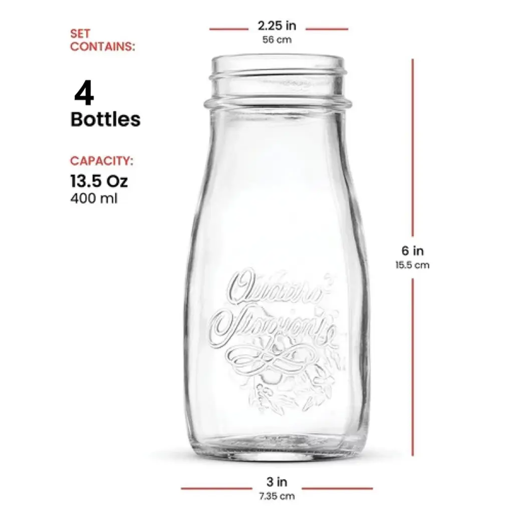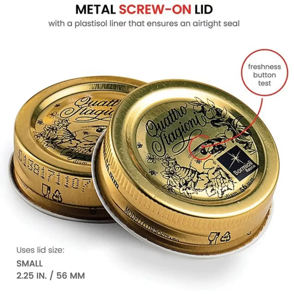 The Bormioli Rocco Quattro Stagioni 6.75 oz. Glass Bottles offer a versatile and stylish solution for canning, food storage, serving, and decorative use. Sold as a set of four, these jars are crafted in Italy with a distinctive embossed motif featuring a beehive and fresh produce, making them equally suitable for both functional kitchen tasks and elegant table presentation. Whether you are preserving jams, sauces, or vegetables, preparing cocktails, presenting trendy recipes, or creating thoughtful homemade gifts, these jars deliver charm and reliability. Each jar includes a one-piece twist top lid with a unique vacuum sealing system designed for safe food preservation. The flexible gasket provides secure adhesion during the pasteurization process, ensuring freshness while keeping air out. You can actually hear the reassuring "pop" when the jar is opened, confirming the vacuum seal. These jars are ideal for canning using the au bain-marie method, as well as for storing dry goods, spices, or decorative floral arrangements. The dishwasher-safe glass makes cleanup simple, while the lid should be hand washed without detergent to preserve its sealing ability. Please note that lids should be replaced when used for canning. Combining beauty, practicality, and authentic craftsmanship, the Bormioli Rocco Quattro Stagioni bottles are a must-have addition to any kitchen or dining setting.