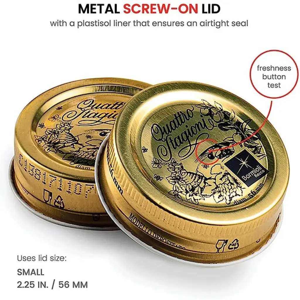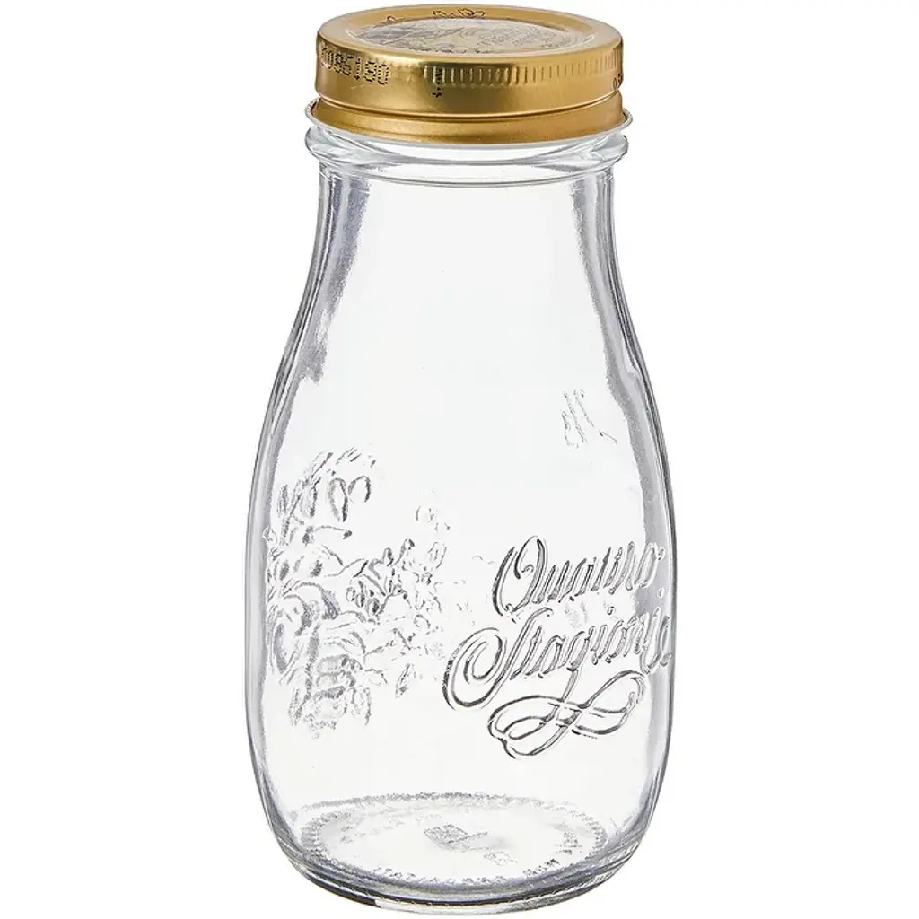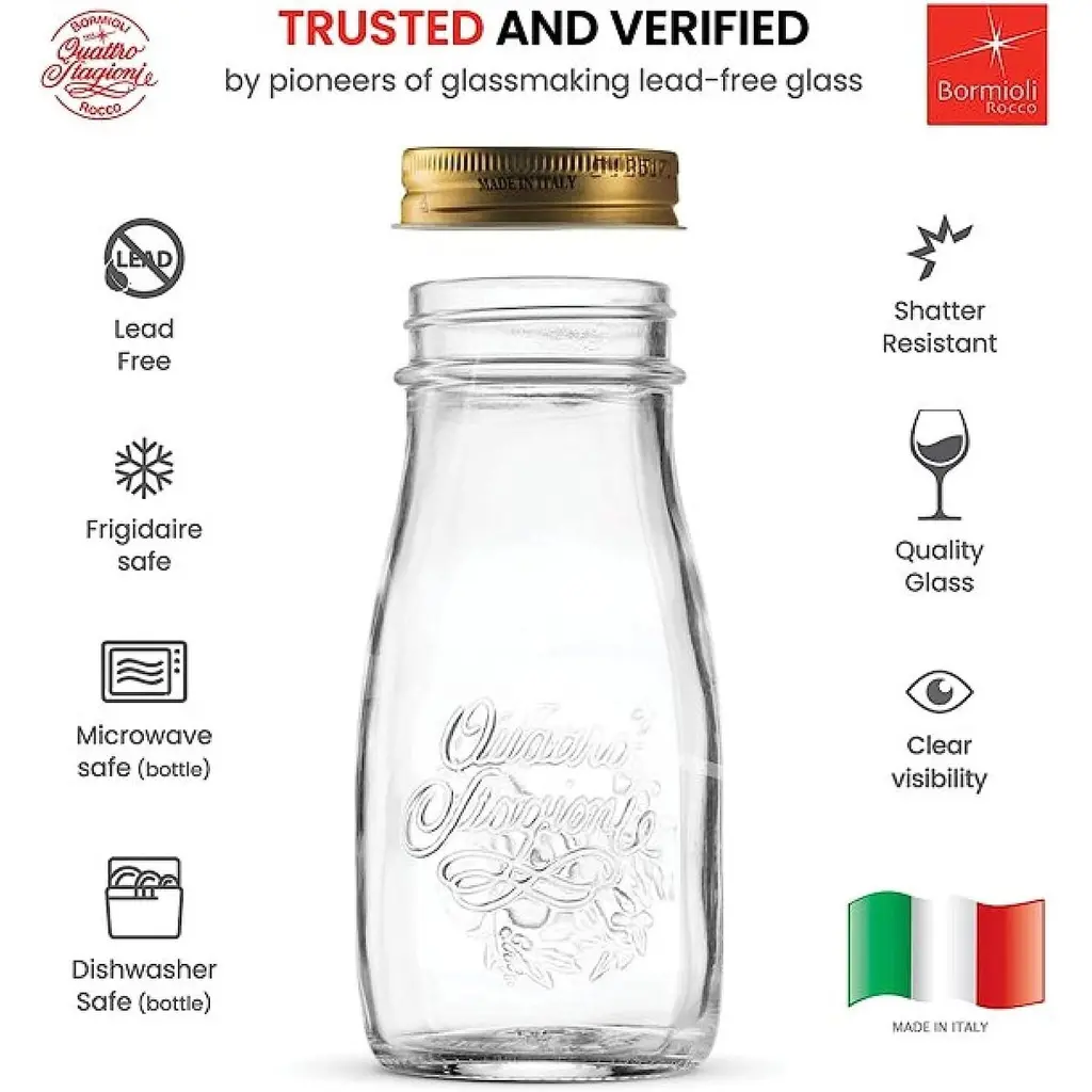 Bormioli Rocco Quattro Stagioni, Set Of 6, Glass Canning Mason Jars And Drinking Bottles - NewThe Bormioli Rocco Quattro Stagioni Set is a collection of six glass canning Mason jars and drinking bottles. Each jar has a capacity of 13.5/5.75 ounces and comes with gold metal airtight lids. Crafted in Italy, these jars are not only functional for canning purposes but also stylish for serving drinks. The Quattro Stagioni set offers a blend of practicality and elegance, making it a versatile addition to any kitchen or dining space.FEATURES:COLOR:MATERIAL:WHAT'S IN THE BOX:PACKAGING: Retail Packaging